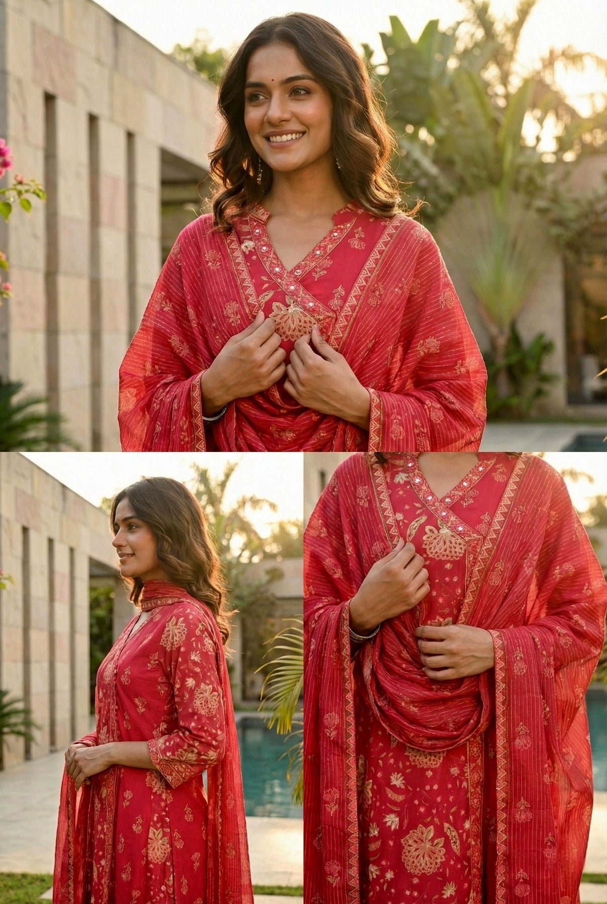 Elevate your ethnic wardrobe with this stunning magenta cotton thread embroidery suit set. Crafted with meticulous attention to detail, the intricate threadwork adds timeless elegance to every occasion. The rich magenta hue complements all skin tones, while the breathable cotton fabric ensures comfort throughout the day. Perfect for festivals, celebrations, or everyday sophistication, this versatile ensemble combines traditional artistry with modern style. Experience the perfect blend of comfort and grace that makes this suit set an essential addition to your collection.