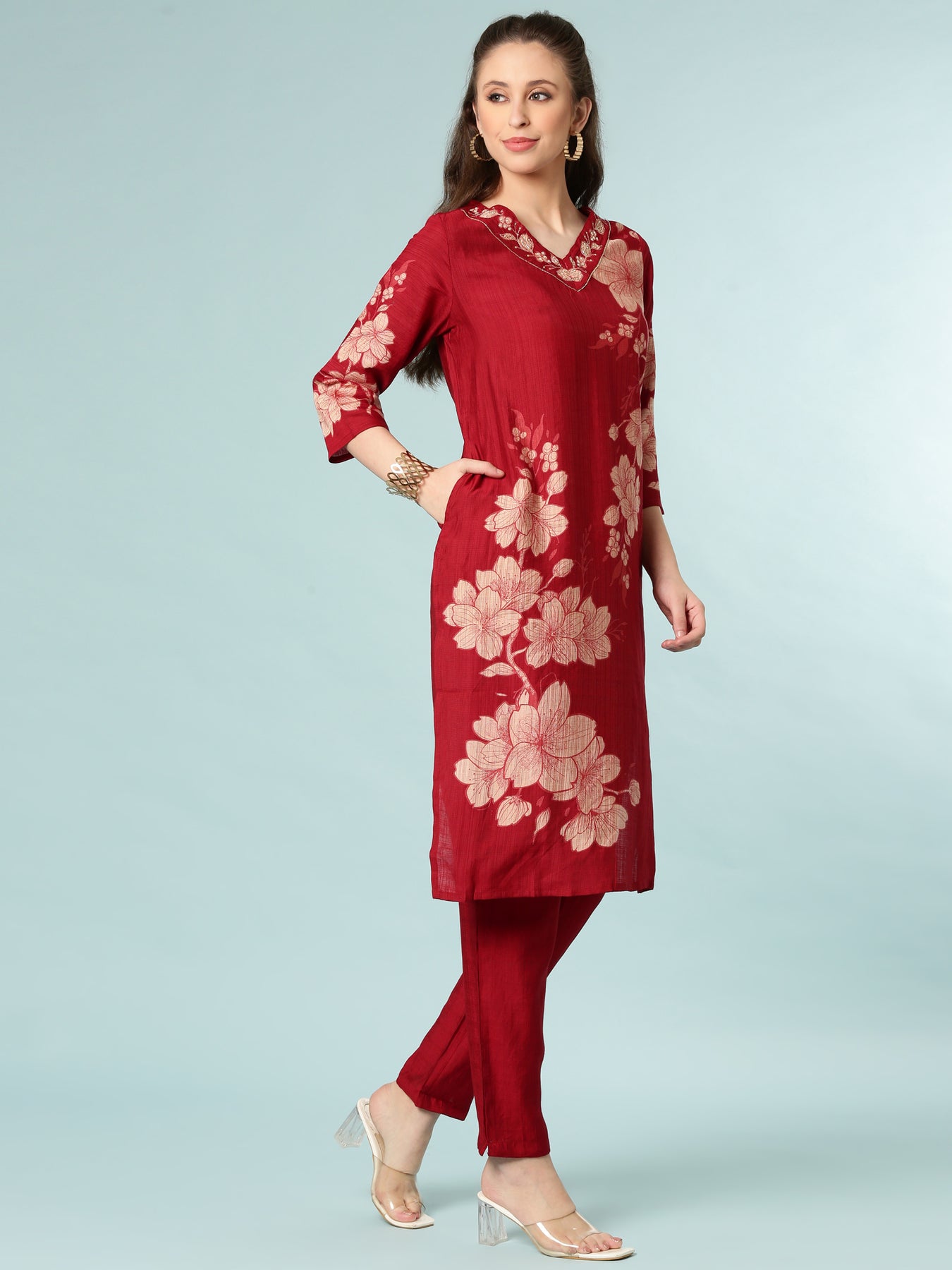 Embrace elegance with this stunning maroon viscose rayon two-piece set, featuring delicate floral prints that add a touch of sophistication to your wardrobe. The soft, breathable fabric drapes beautifully, offering comfort throughout the day while maintaining a polished appearance. Perfect for casual outings, celebrations, or intimate gatherings, this versatile set combines traditional charm with contemporary style. The rich maroon hue complements various skin tones, making it an essential addition to your collection. Whether you're dressing up for a special occasion or seeking everyday comfort, this thoughtfully designed piece delivers both grace and practicality.
