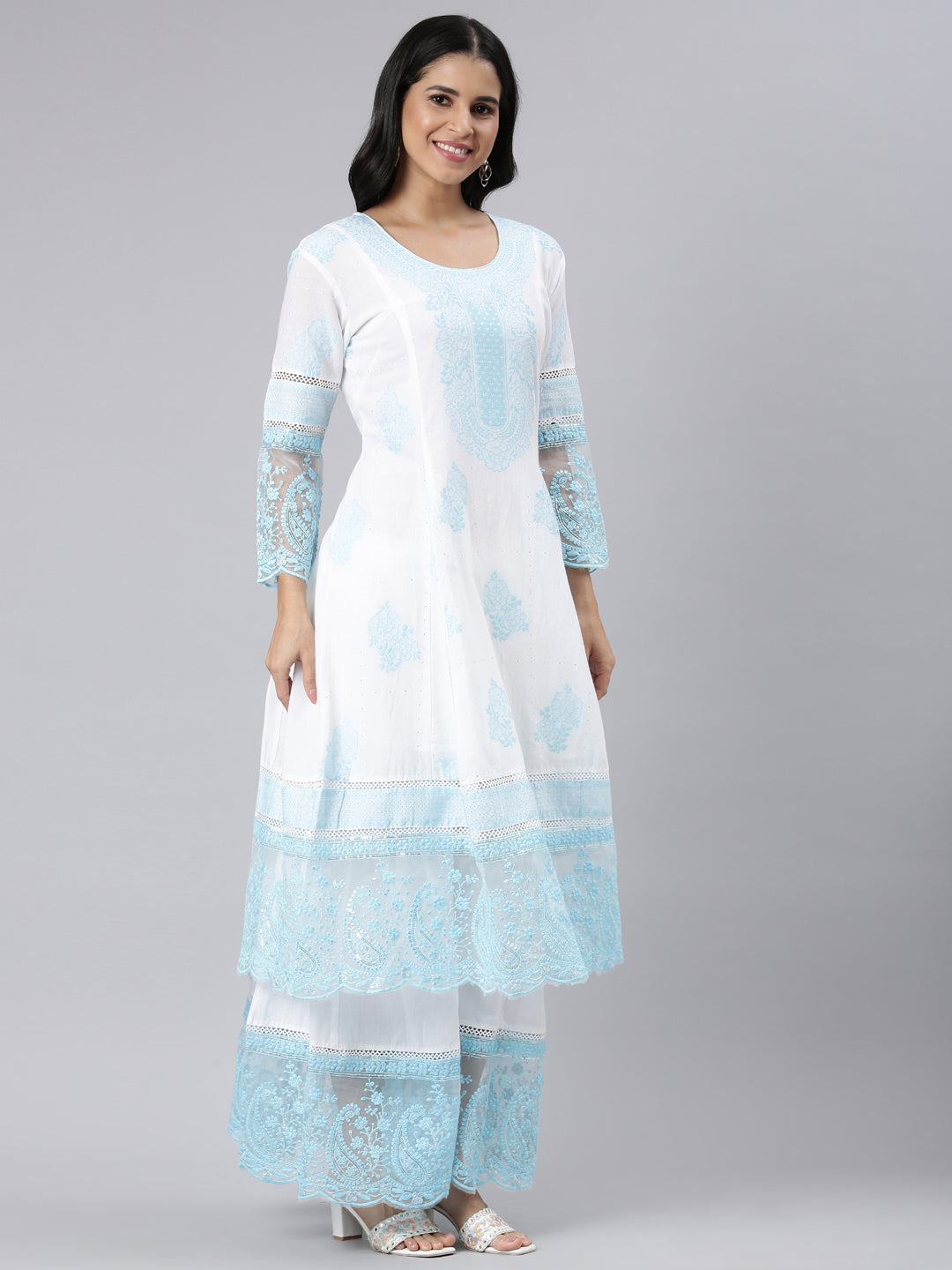 Neerus Blue Panelled Straight Embroidered Kurta and Palazzos With Dupatta With intricate embroidery and a classic blue hue, this set will effortlessly elevate your wardrobe.