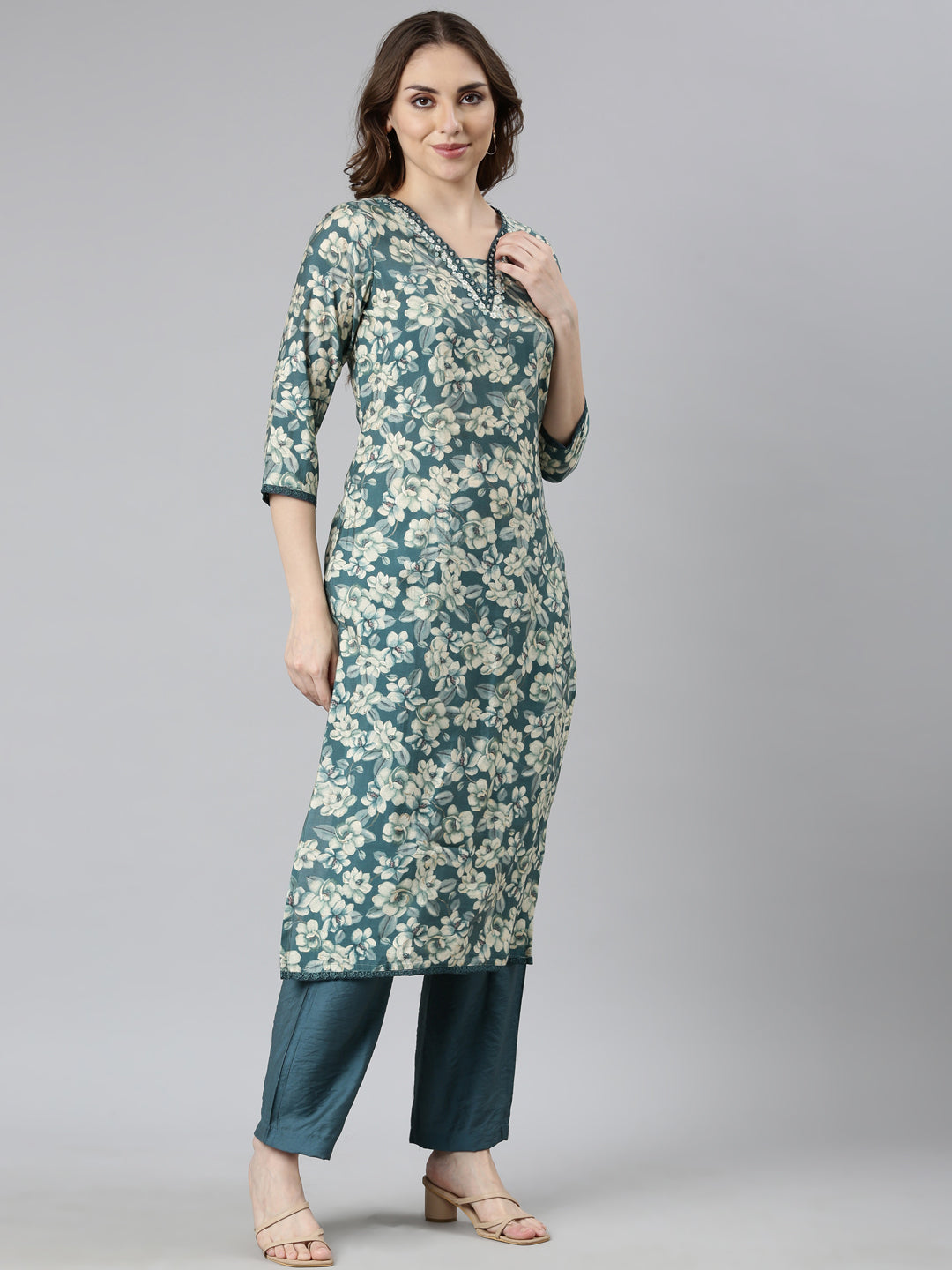 Neerus Blue Regular Straight Floral Kurta And Trousers With Dupatta