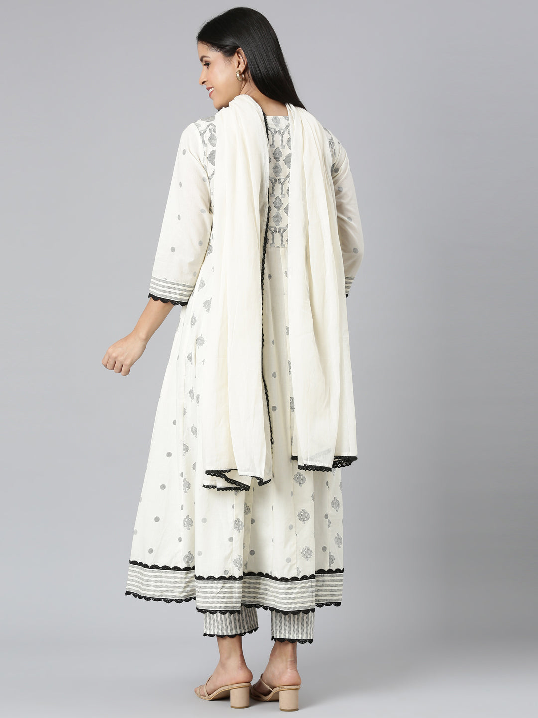 Neerus Cream Regular Straight Printed Kurta and Trousers With Dupatta It's a versatile set that's perfect for any occasion, ensuring comfort and style.