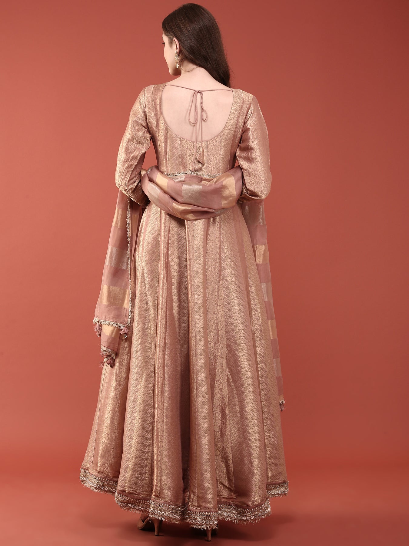 Elevate your ethnic wardrobe with this stunning Onion Pink Banaras Silk Anarkali set, a timeless piece perfect for celebrations and special occasions. Crafted from luxurious Banaras silk, this ensemble features intricate heavy zari embroidery that showcases traditional craftsmanship at its finest. The graceful Anarkali silhouette flatters all body types while the rich onion pink hue complements various skin tones beautifully.