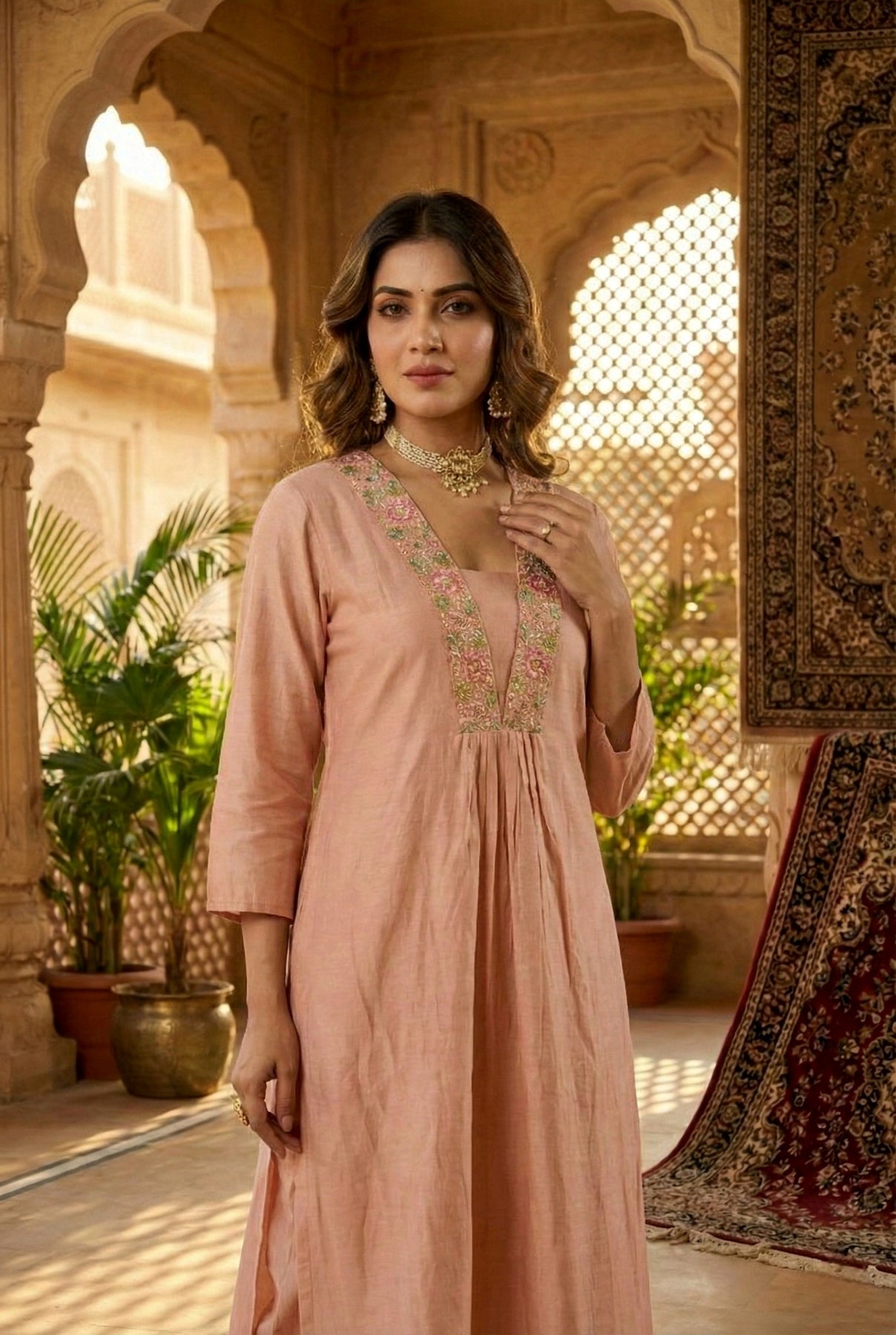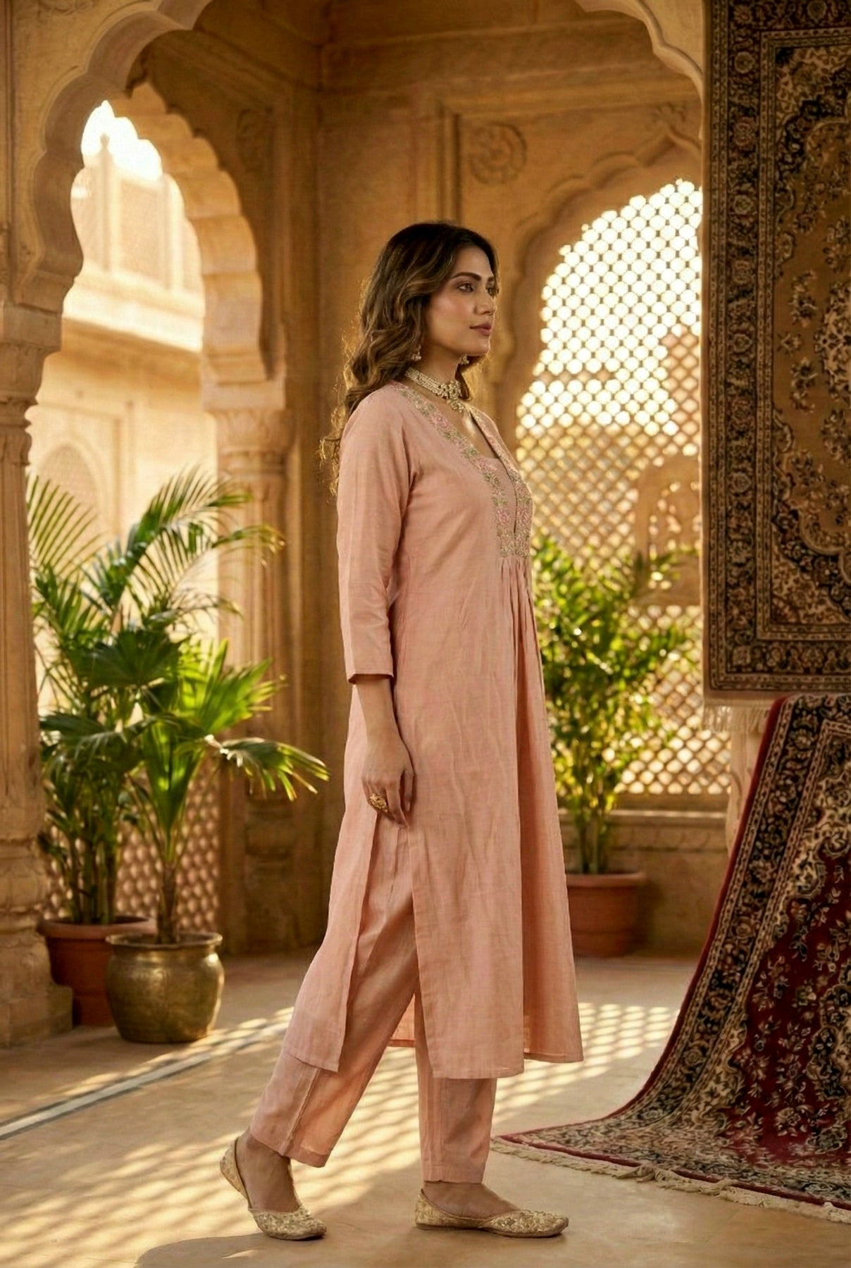 Embrace effortless elegance with this stunning peach muslin two-piece set. Crafted from breathable muslin fabric, this versatile ensemble features a perfectly coordinated top and bottom in a soft, flattering peach tone. Ideal for casual outings, intimate gatherings, or relaxed home wear, the set combines comfort with contemporary style. The lightweight muslin ensures all-day wearability in warm weather, while the coordinated design makes getting dressed simple and chic. Perfect for those seeking understated sophistication with a touch of warmth.