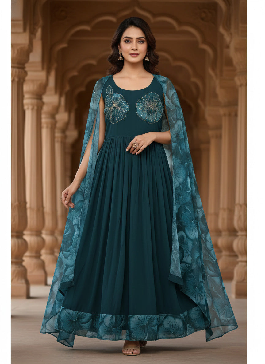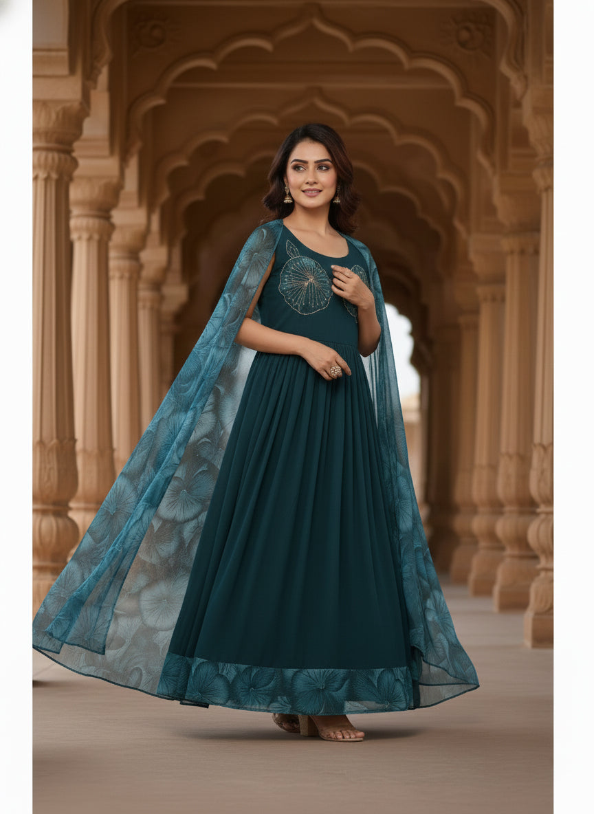 Embrace timeless elegance with this stunning peacock georgette floral printed long dress. Crafted from lightweight, breathable georgette fabric, this piece drapes beautifully while keeping you comfortable throughout the day. The intricate peacock and floral print adds a touch of nature-inspired sophistication to your wardrobe. Perfect for festive occasions, celebrations, or elevated everyday wear, this dress combines traditional charm with contemporary style. The flowing silhouette flatters all body types, making it an ideal choice for anyone seeking grace and poise in their ethnic collection.