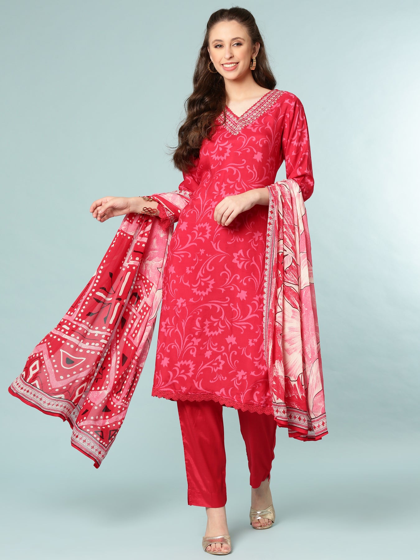 Embrace timeless elegance with this stunning Rani Pink Dola Silk Digital Print Three Piece Set. Crafted from luxurious dola silk, this ensemble features vibrant digital prints that showcase intricate artistry and contemporary design. The three-piece collection offers versatility for any occasion, combining traditional craftsmanship with modern aesthetics. Perfect for celebrations, festivals, or special gatherings, this set drapes beautifully and provides comfort throughout the day.