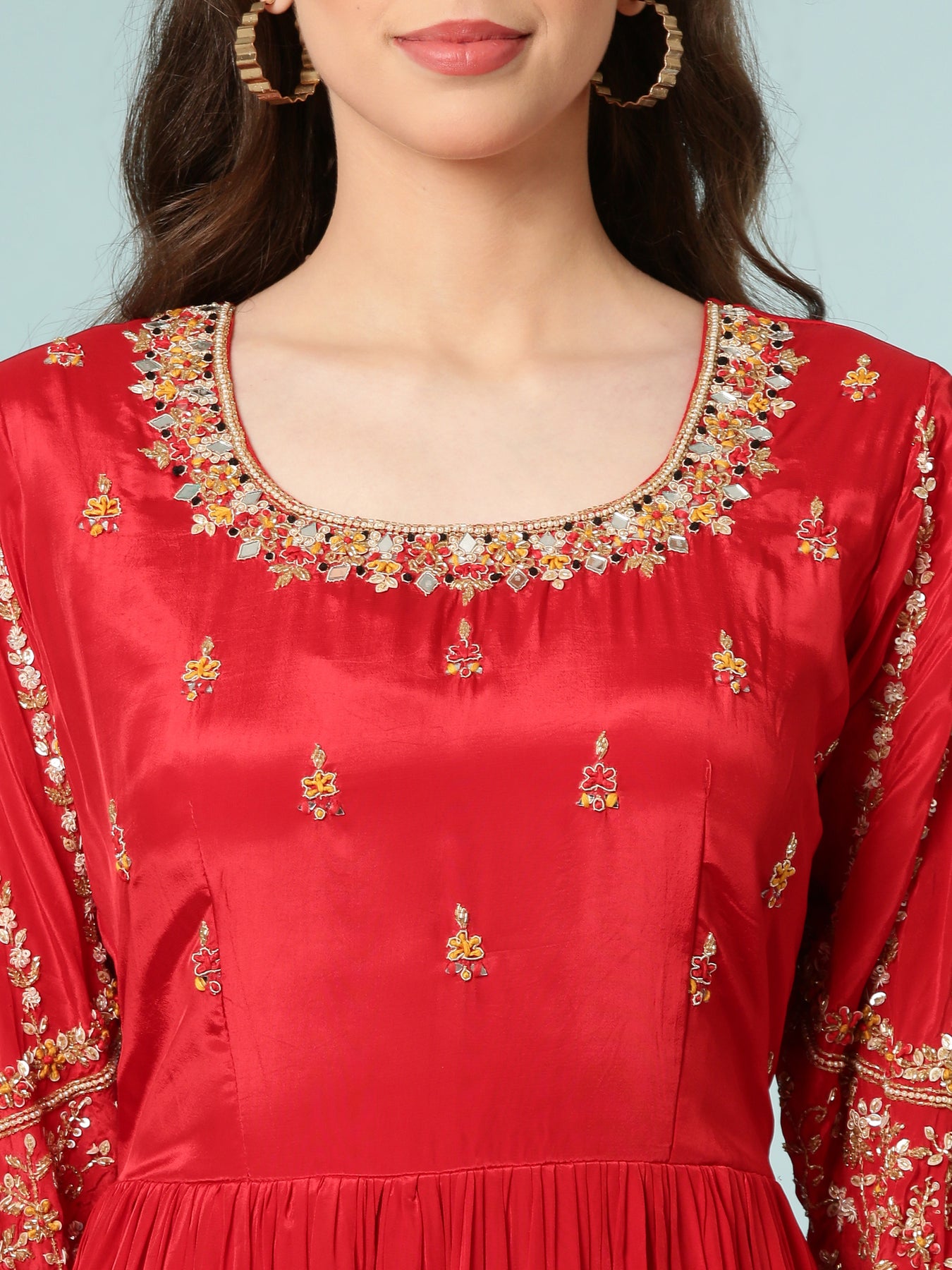 Embrace timeless elegance with this stunning Red Tissue Anarkali Set. Crafted from luxurious tissue fabric, this traditional ensemble features a gracefully flowing anarkali silhouette that flatters every frame. The rich red hue exudes sophistication and confidence, making it perfect for weddings, festivals, and special celebrations.