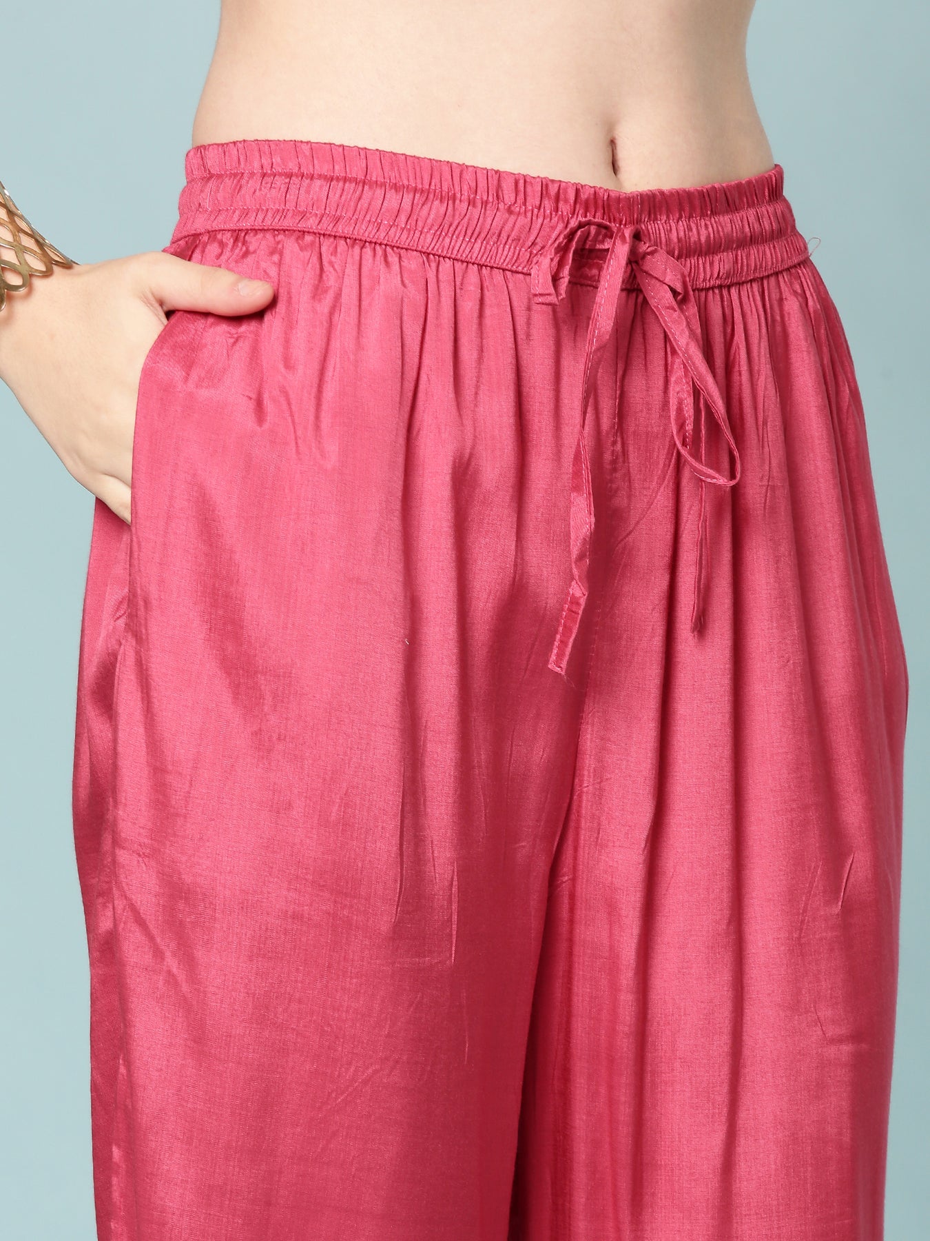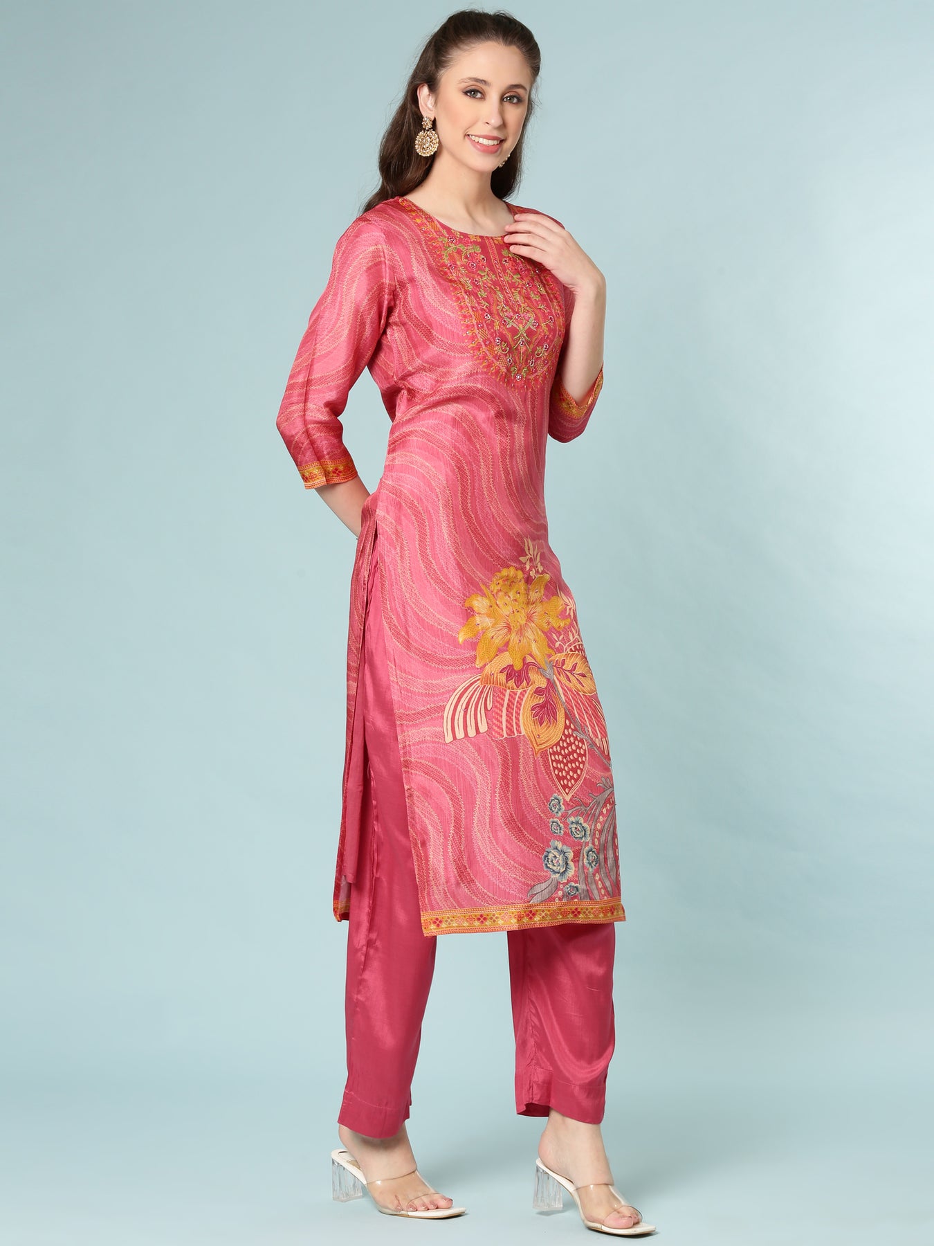 Embrace timeless elegance with this stunning Rose Pink Dola Silk Floral Digital Print Three Piece Set. Crafted from luxurious dola silk, this ensemble features exquisite digital floral prints that bring sophistication to your wardrobe. The three-piece design offers versatility for various occasions, allowing you to mix and match with ease. Perfect for celebrations, festivals, or everyday wear, this set combines comfort with refined style.