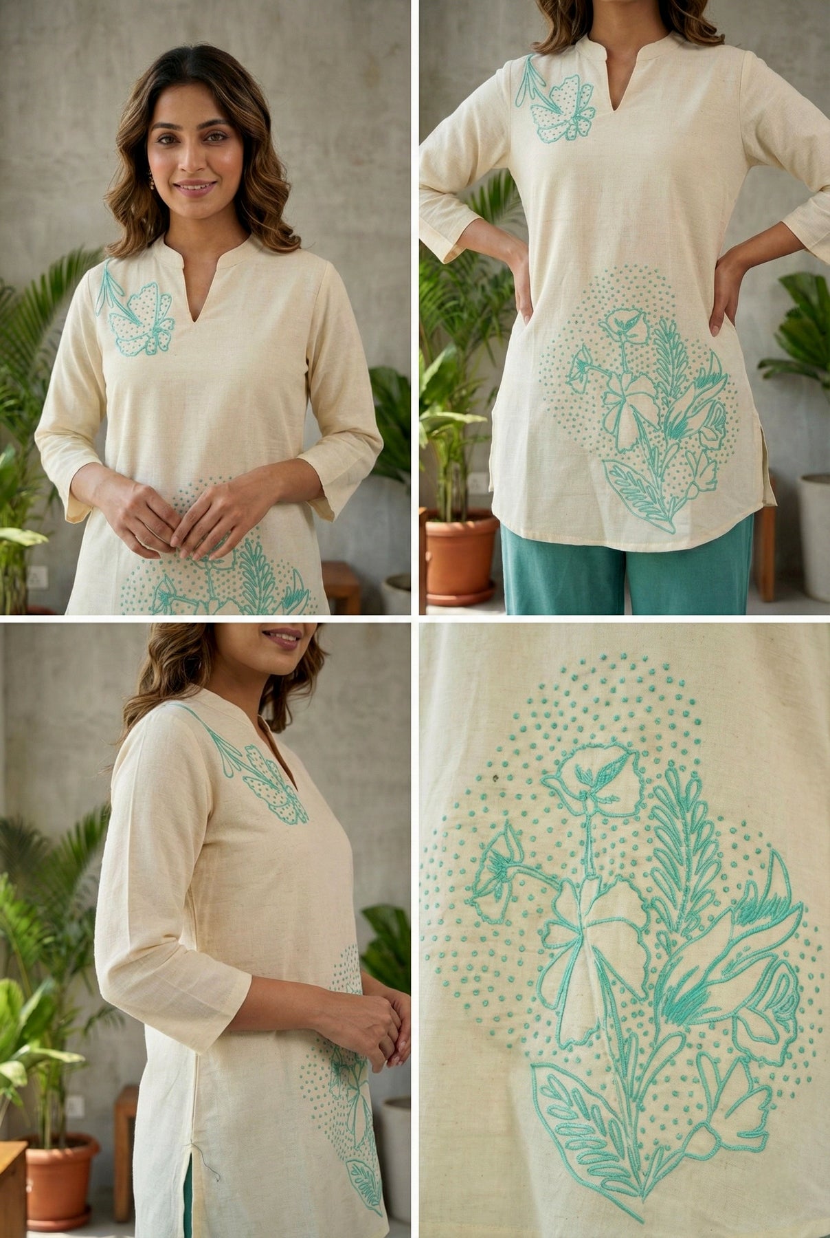 Sea Green Cotton Floral Thread Embroidery Two Piece Set Crafted from premium cotton, this two-piece ensemble showcases intricate floral thread embroidery in a sophisticated sea green hue. The set combines traditional embroidery artistry with contemporary silhouettes, offering versatility for both casual and semi-formal occasions. The breathable cotton fabric ensures comfort throughout the day, while the detailed threadwork adds refined elegance to your wardrobe. Perfect for those who appreciate handcrafted details and timeless ethnic wear.