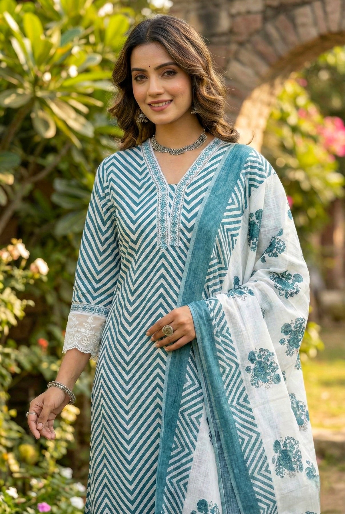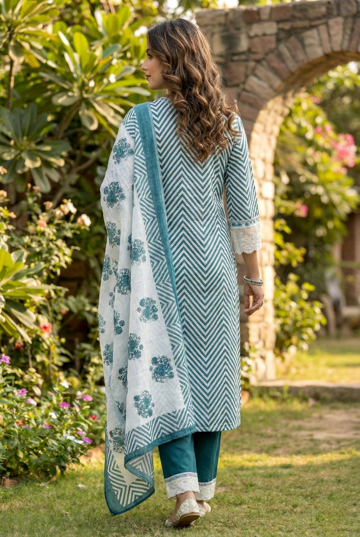 Elevate your everyday wardrobe with this stunning teal blue three-piece set, crafted from soft, breathable cotton. The eye-catching chevron print adds contemporary flair to a versatile ensemble perfect for any occasion. This coordinated set offers effortless styling—mix and match the pieces to create multiple looks throughout your week. The comfortable cotton fabric ensures all-day wearability, while the rich teal hue complements various skin tones beautifully. Whether you're dressing up for work or keeping it casual, this thoughtfully designed set makes getting ready simple and stylish.