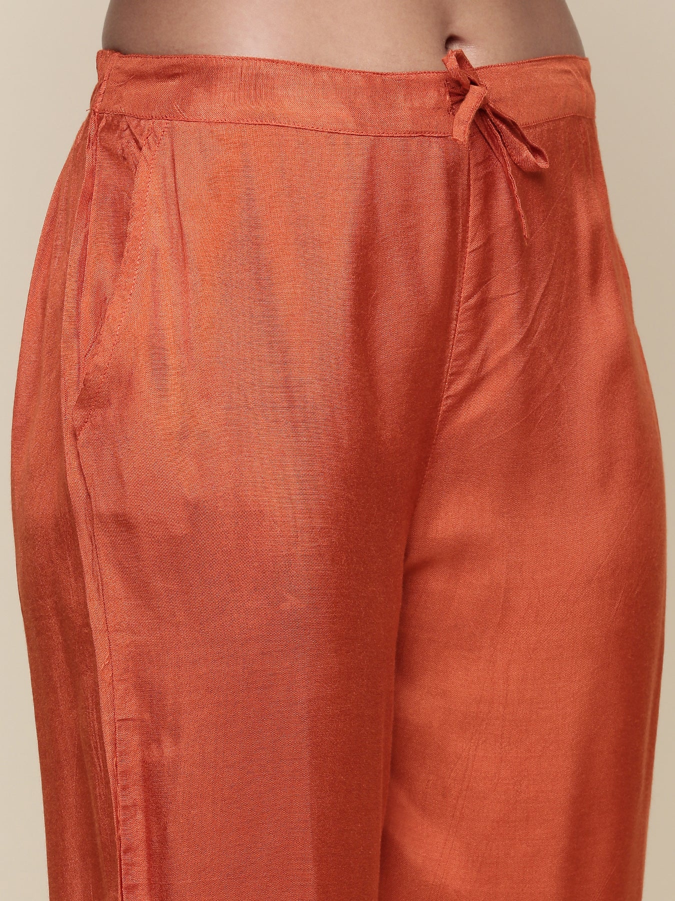 Elevate your wardrobe with this Burnt Orange Dola Silk Three Piece Suit Set. Crafted from lustrous Dola silk, this ensemble offers a rich texture and vibrant color that enhances your natural glow. The set includes a beautifully tailored kurta, matching bottoms, and a coordinating dupatta, perfect for festive occasions or elegant gatherings. Experience the blend of tradition and modern style while feeling comfortable and confident throughout your day.