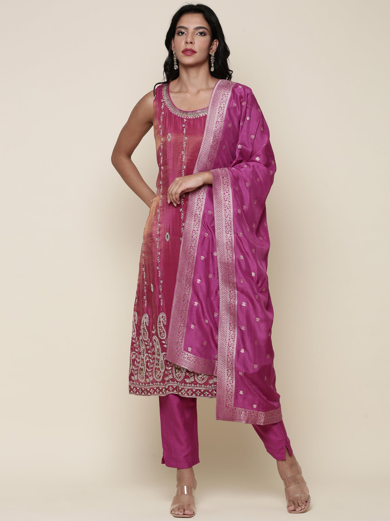 Elevate your wardrobe with this Magenta Tissue embroidered three-piece suit set. Crafted from lightweight tissue fabric, it offers a refined texture and graceful drape. The delicate embroidery adds an elegant touch, perfect for formal occasions. This set includes a beautifully embroidered kurta, matching bottoms, and a coordinating dupatta, combining comfort with timeless sophistication. Ideal for those seeking a poised and stylish ensemble.