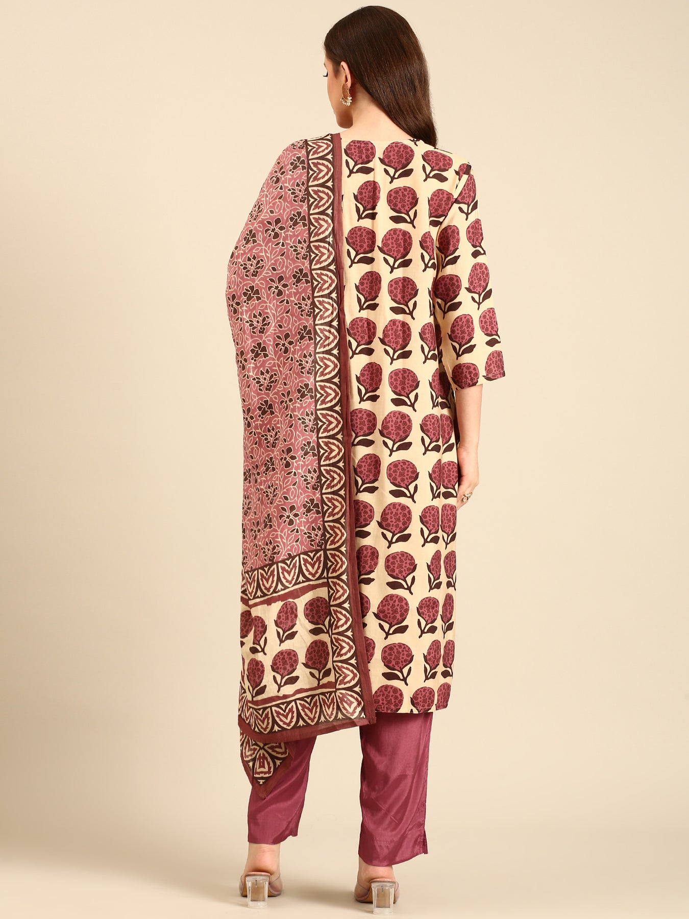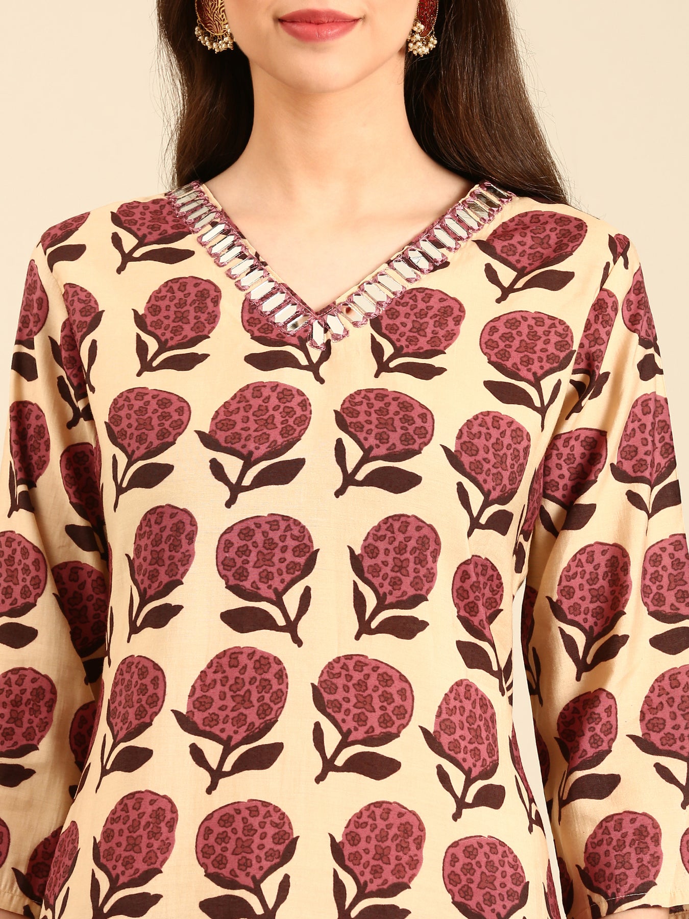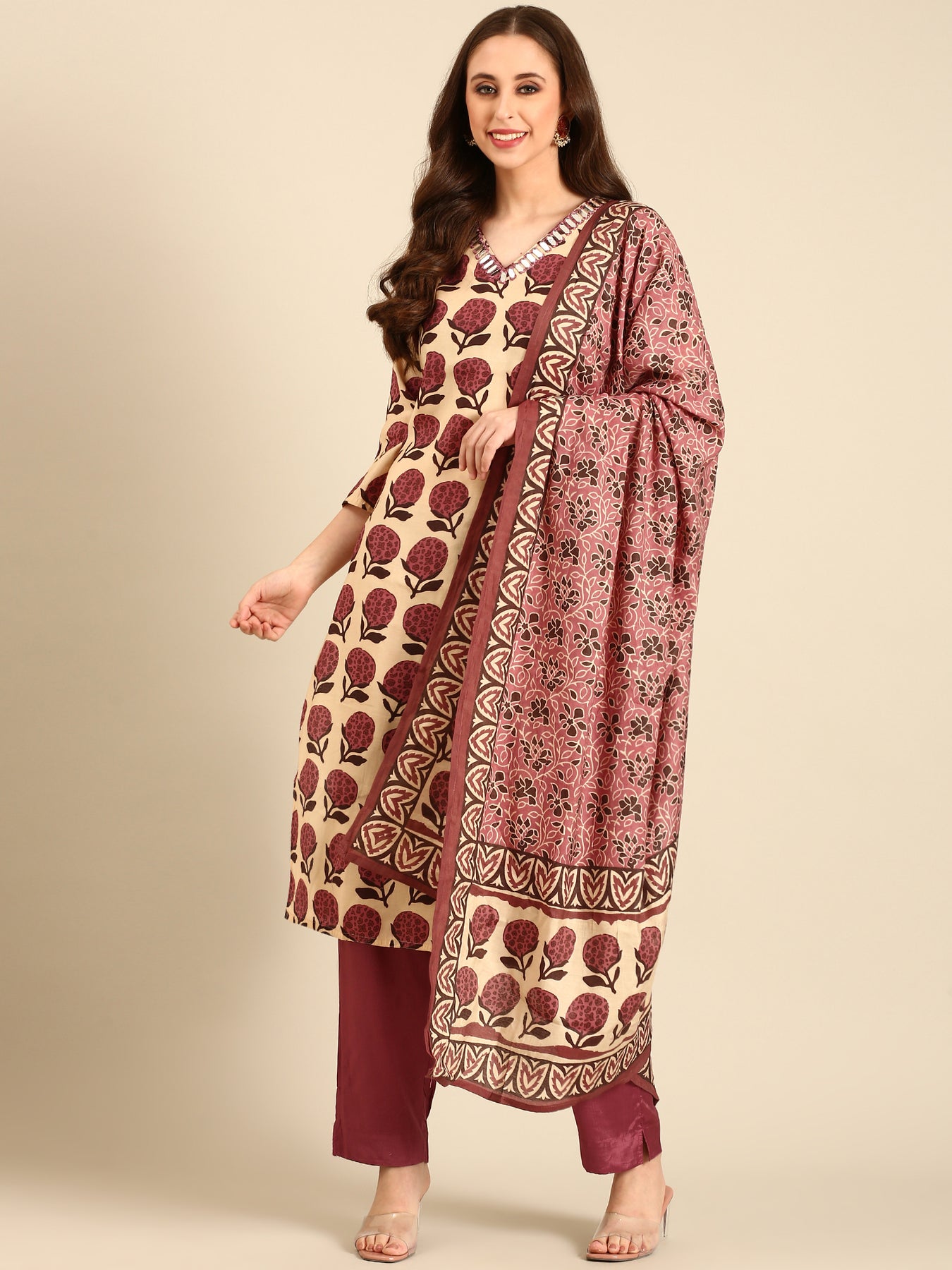 Elevate your ethnic wardrobe with this maroon block printed suit set featuring a soft wine modal silk fabric adorned with intricate all-over prints. The elegant V-neck design, highlighted by stunning big mirror work, adds a touch of glamour perfect for festive occasions. Complete with a matching dupatta, this set combines comfort and style effortlessly, making it a must-have for sophisticated celebrations.