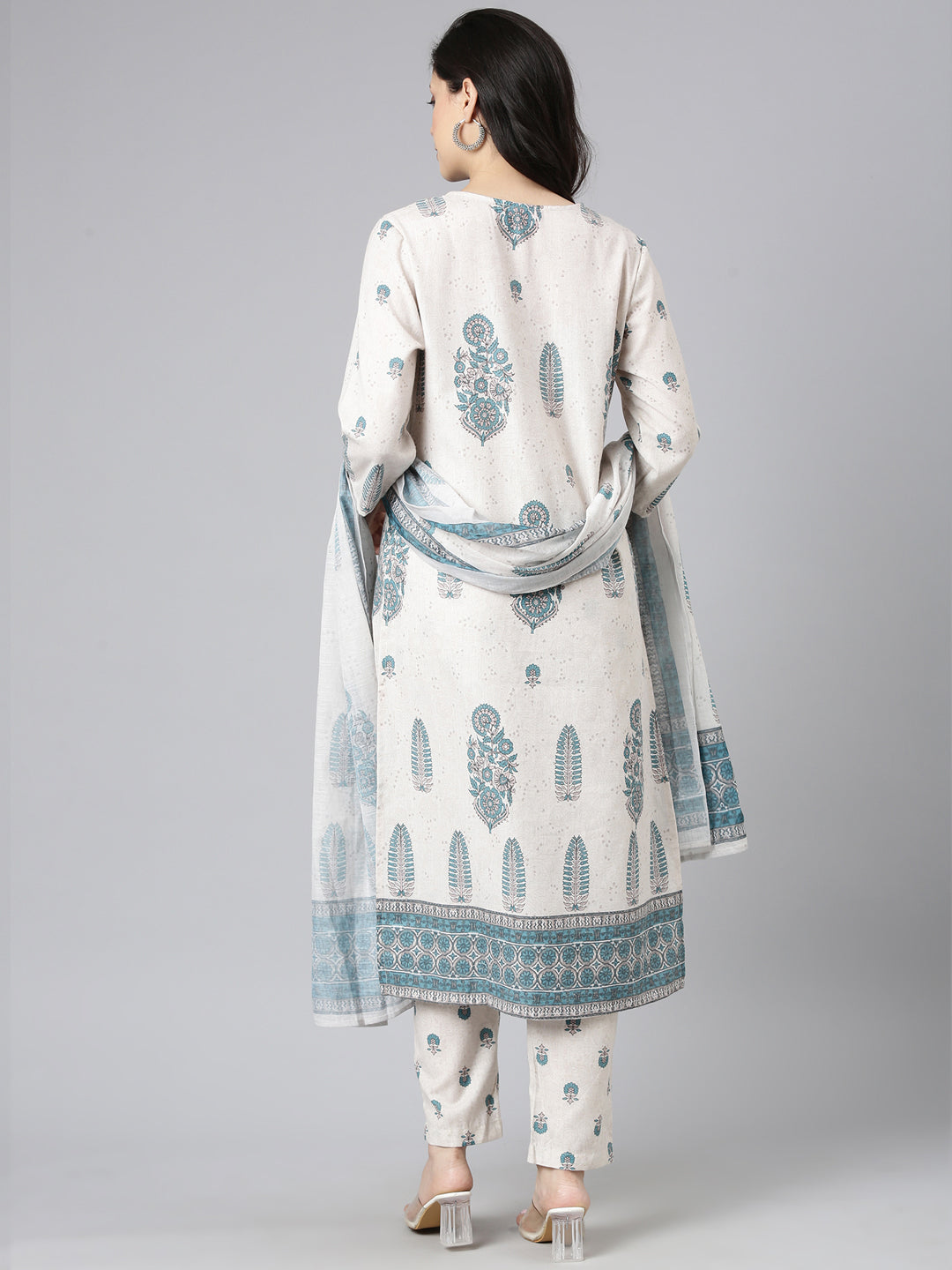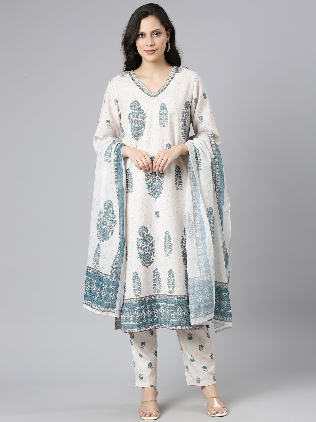 Elevate your ethnic wardrobe with the Neerus Beige Printed Straight Kurta and Trousers set, complemented by a matching dupatta. Crafted for a refined silhouette, the straight kurta features intricate prints that add subtle elegance.