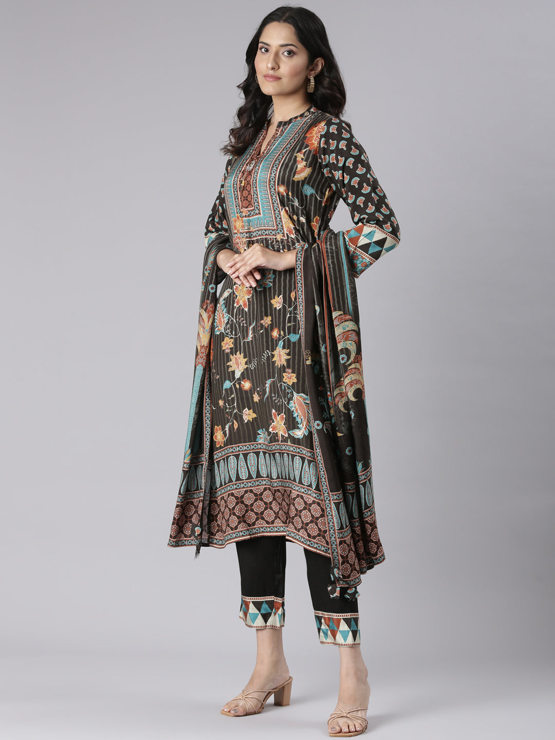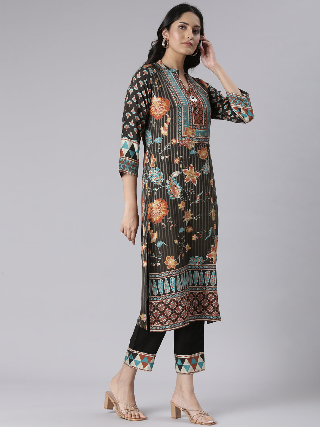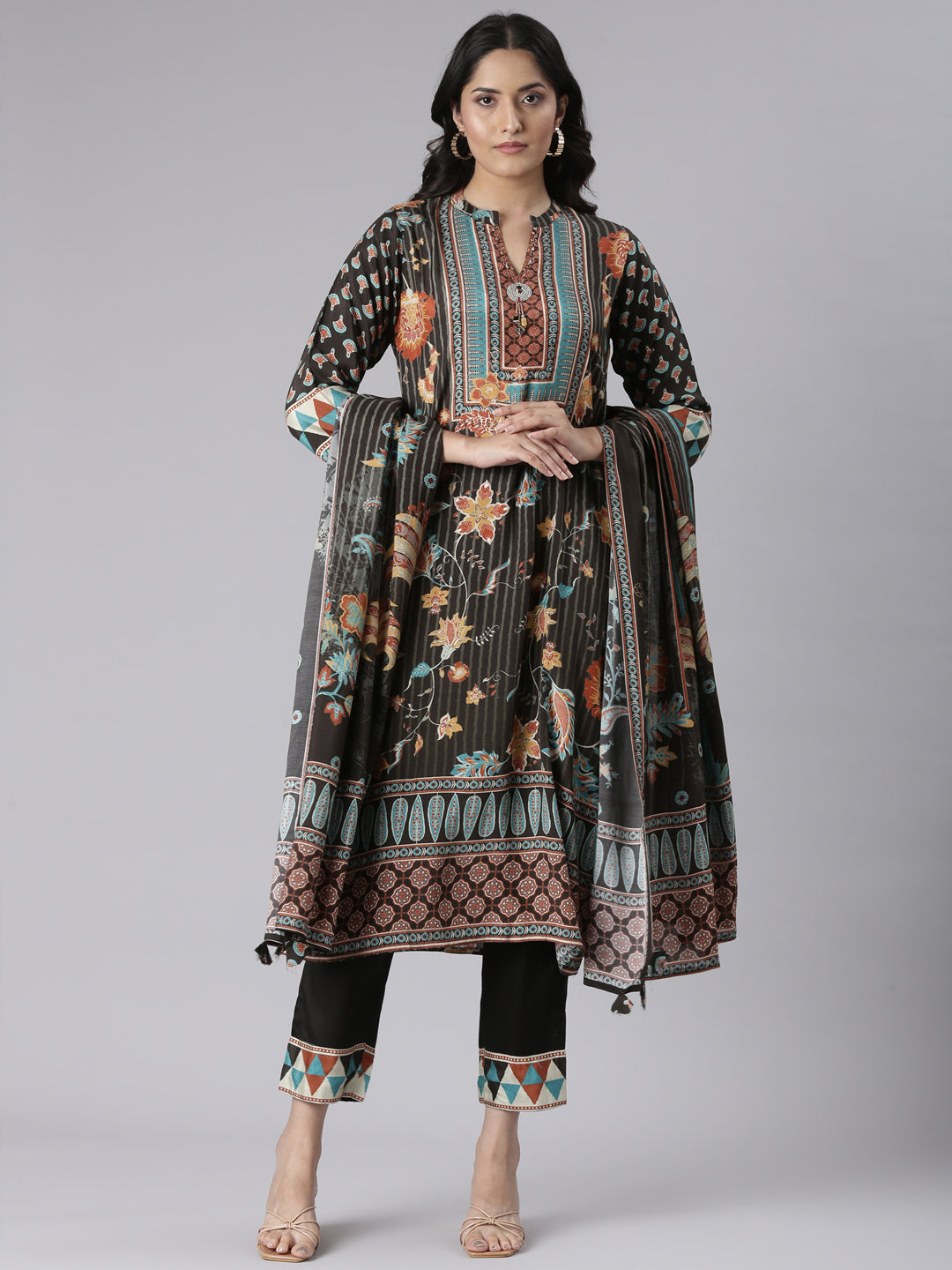 The Neerus Black Printed Straight Kurta and Trousers set, complemented by a matching dupatta, offers a refined blend of classic design and contemporary style. Featuring intricate black prints and a streamlined silhouette, this ensemble provides a polished look suitable for formal events and celebrations.