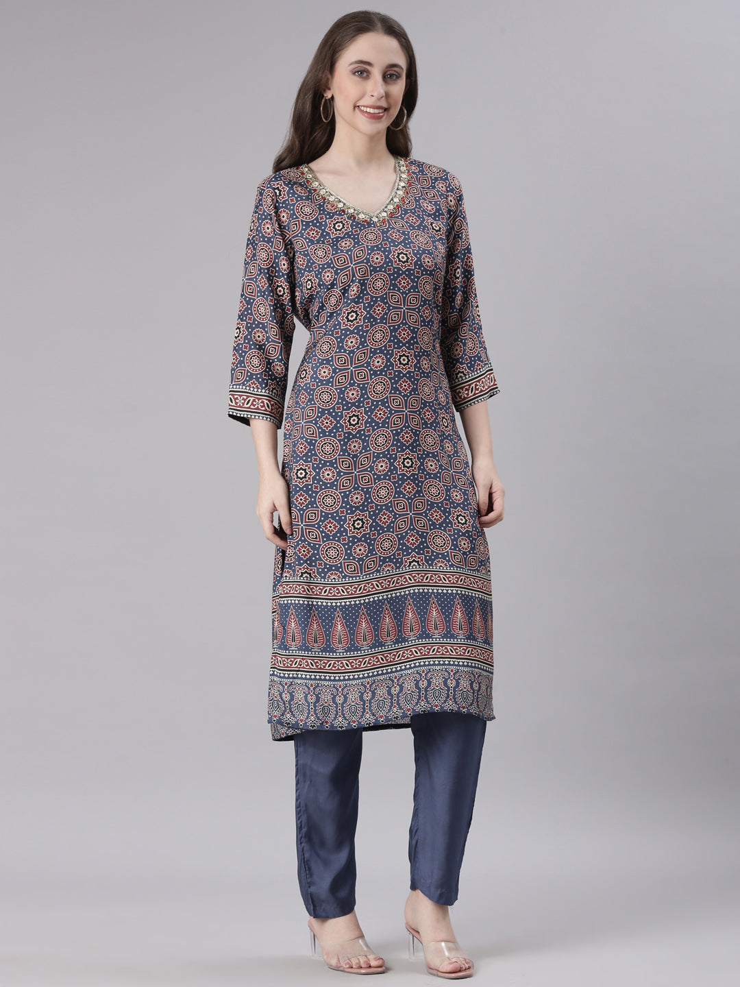 The Neerus Blue Printed Straight Kurta and Trousers set, paired with a matching dupatta, offers a graceful blend of traditional design and modern tailoring. Featuring intricate blue prints and a streamlined silhouette, this ensemble ensures a poised and sophisticated look suitable for festive events and elegant gatherings.