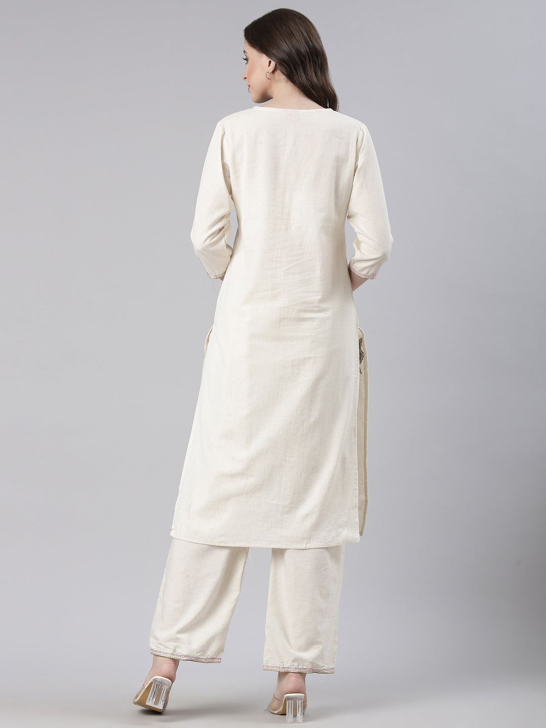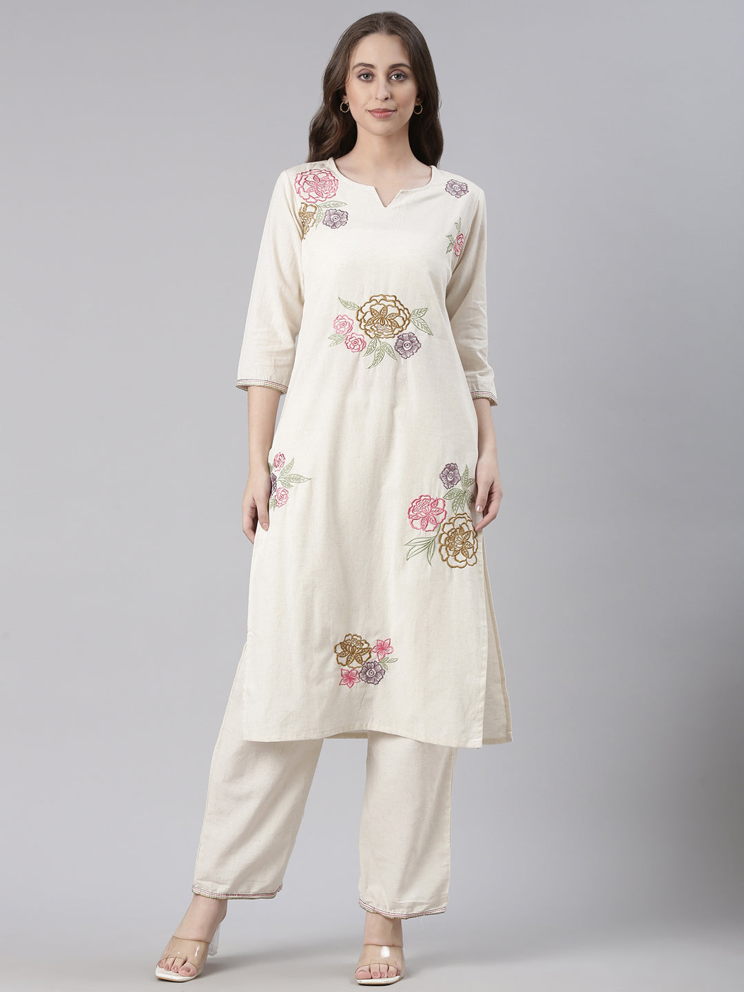 The Neerus Cream Embroidered Straight Kurta and Trousers offer a refined blend of classic design and intricate craftsmanship. Featuring subtle embroidery, this ensemble provides a graceful silhouette that embodies understated elegance.