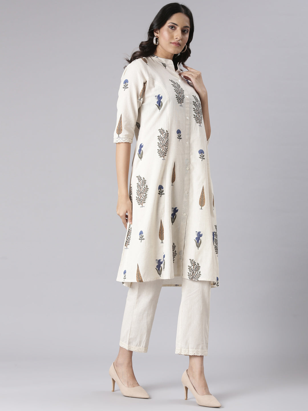 The Neerus Cream Solid Straight Kurta and Trousers set embodies refined elegance with its clean lines and understated cream hue. Designed for a sleek silhouette, the straight kurta pairs effortlessly with matching trousers, offering a sophisticated look ideal for formal events and celebrations.