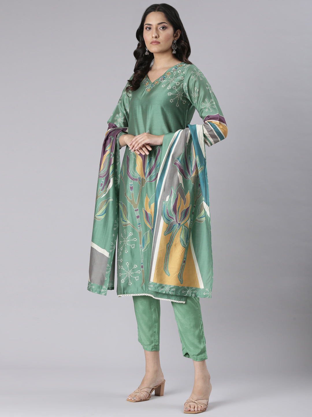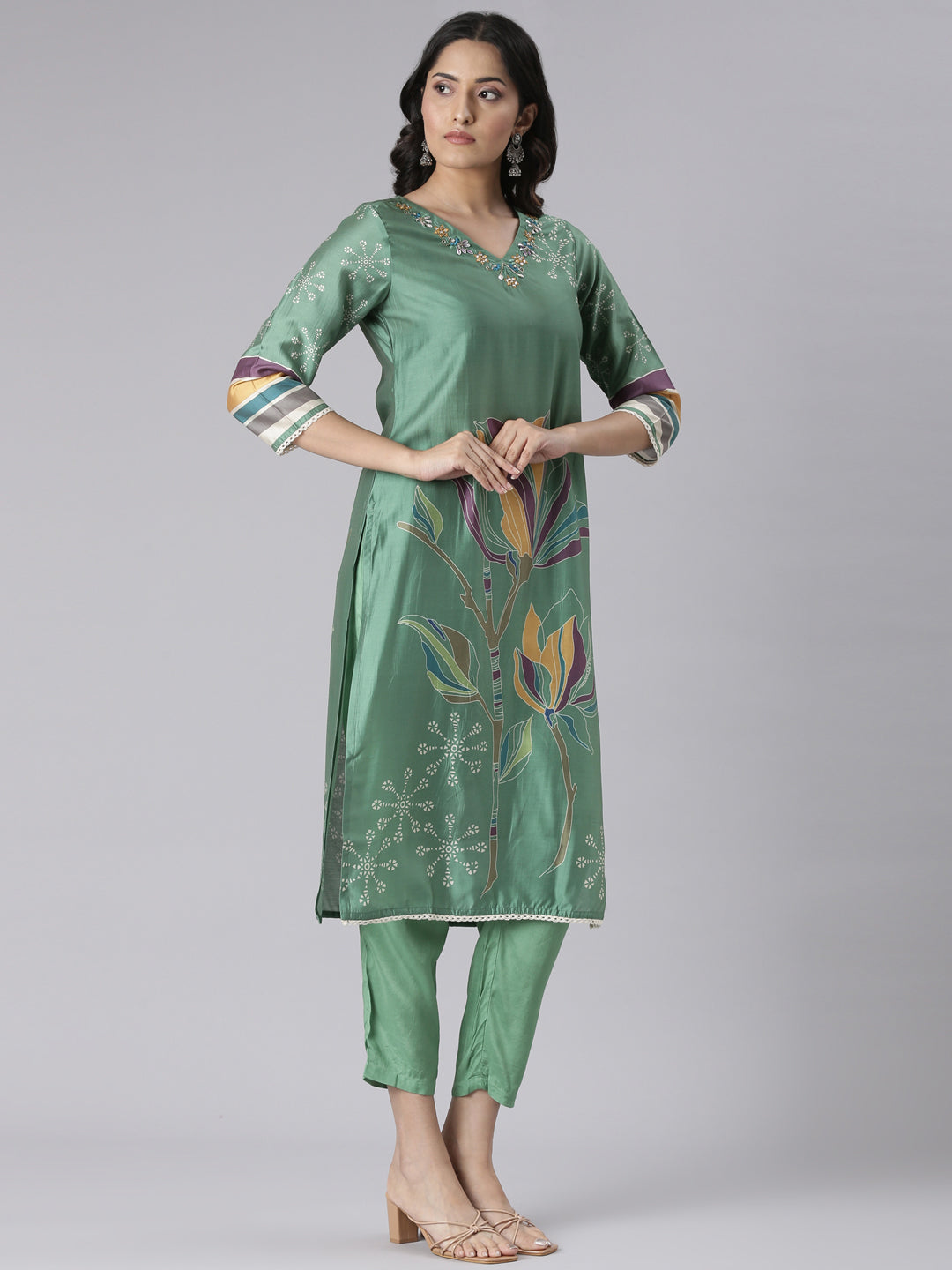 Elevate your ethnic wardrobe with the Neerus Green Printed Straight Kurta and Trousers set, complete with a matching dupatta. Crafted for a refined silhouette, the straight kurta features intricate prints that enhance its elegance.