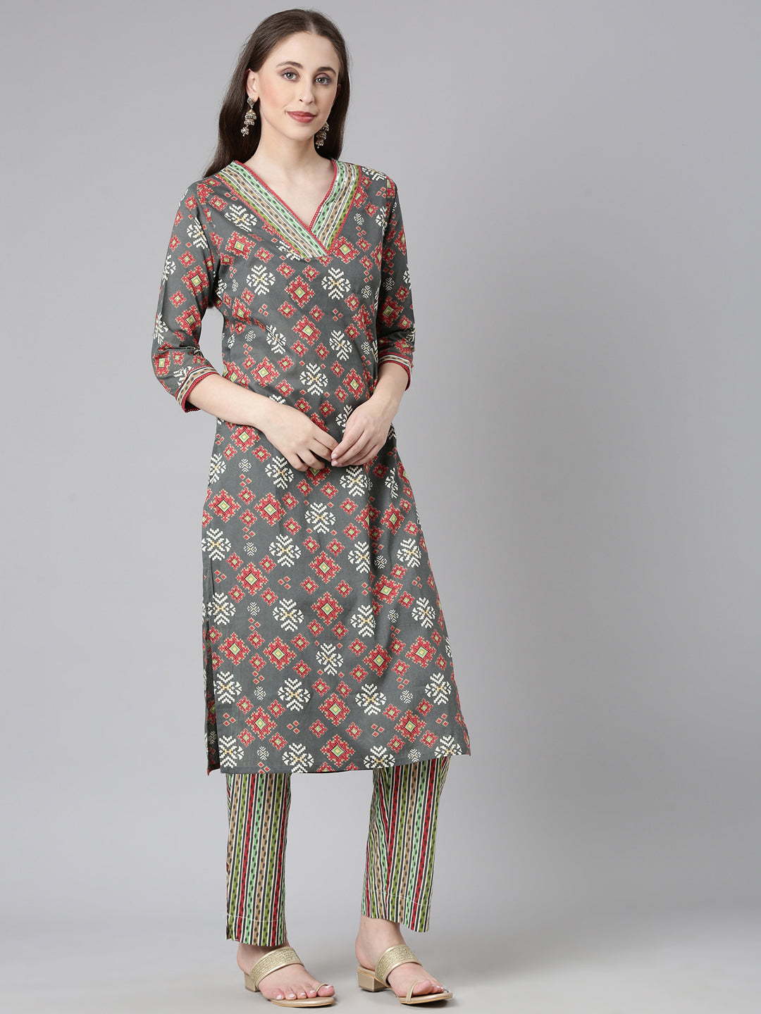 Elevate your ethnic wardrobe with the Neerus Grey Printed Straight Kurta and Trousers set, complemented by a matching dupatta. Crafted for a refined silhouette, the straight kurta features subtle prints that add understated elegance.