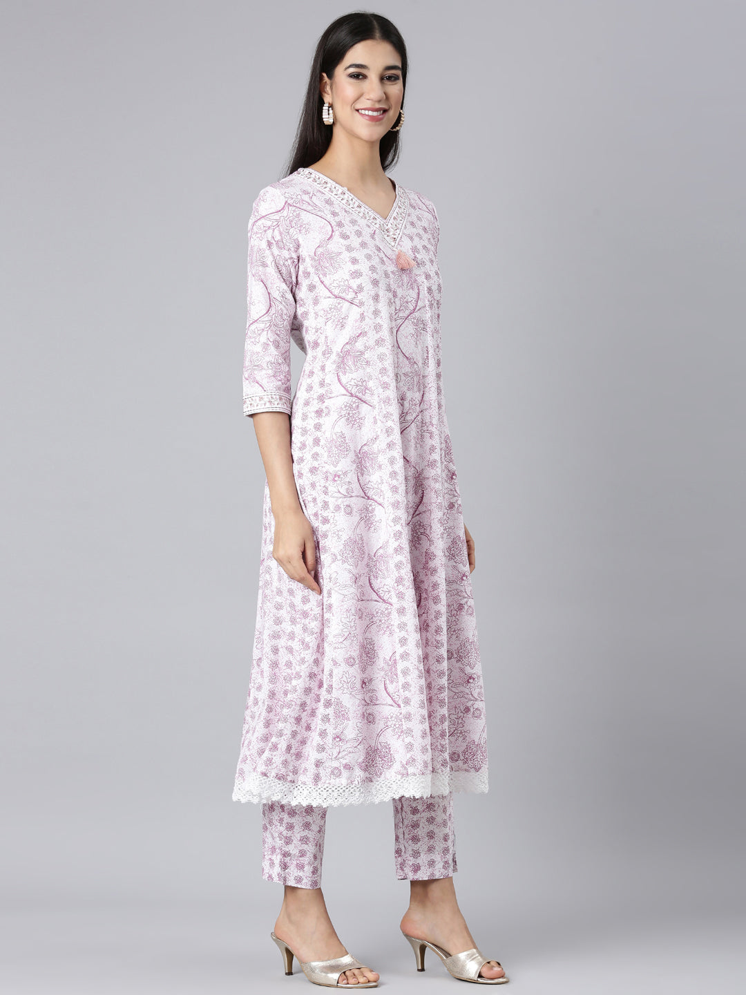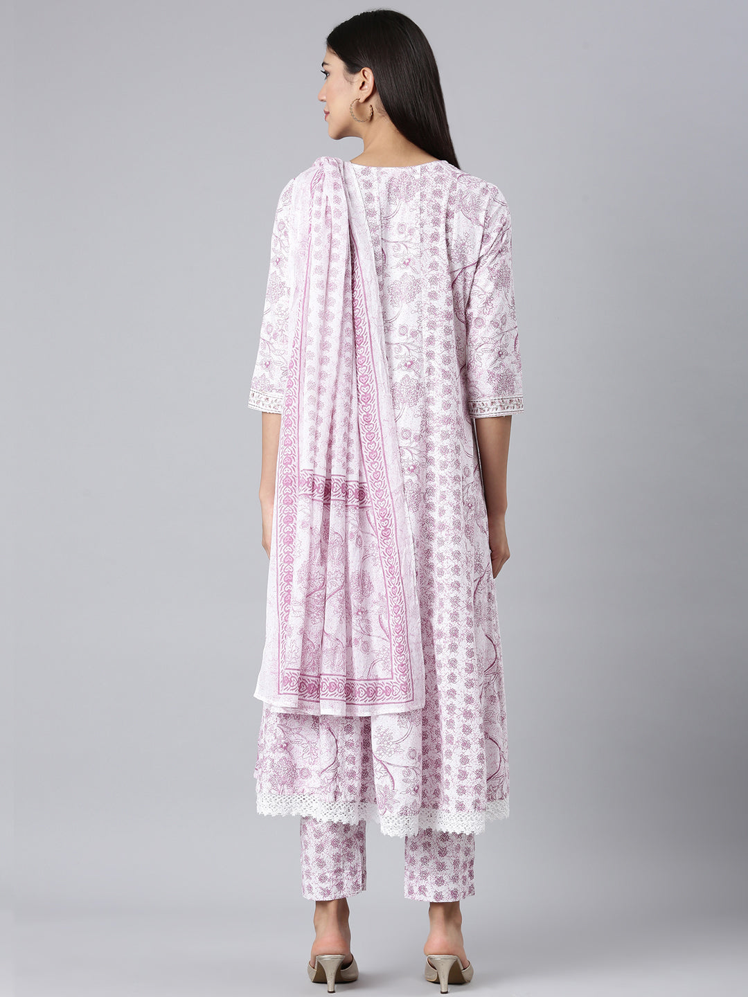 Neerus Lavender Printed Anarkali Kurta and Trousers With Dupatta