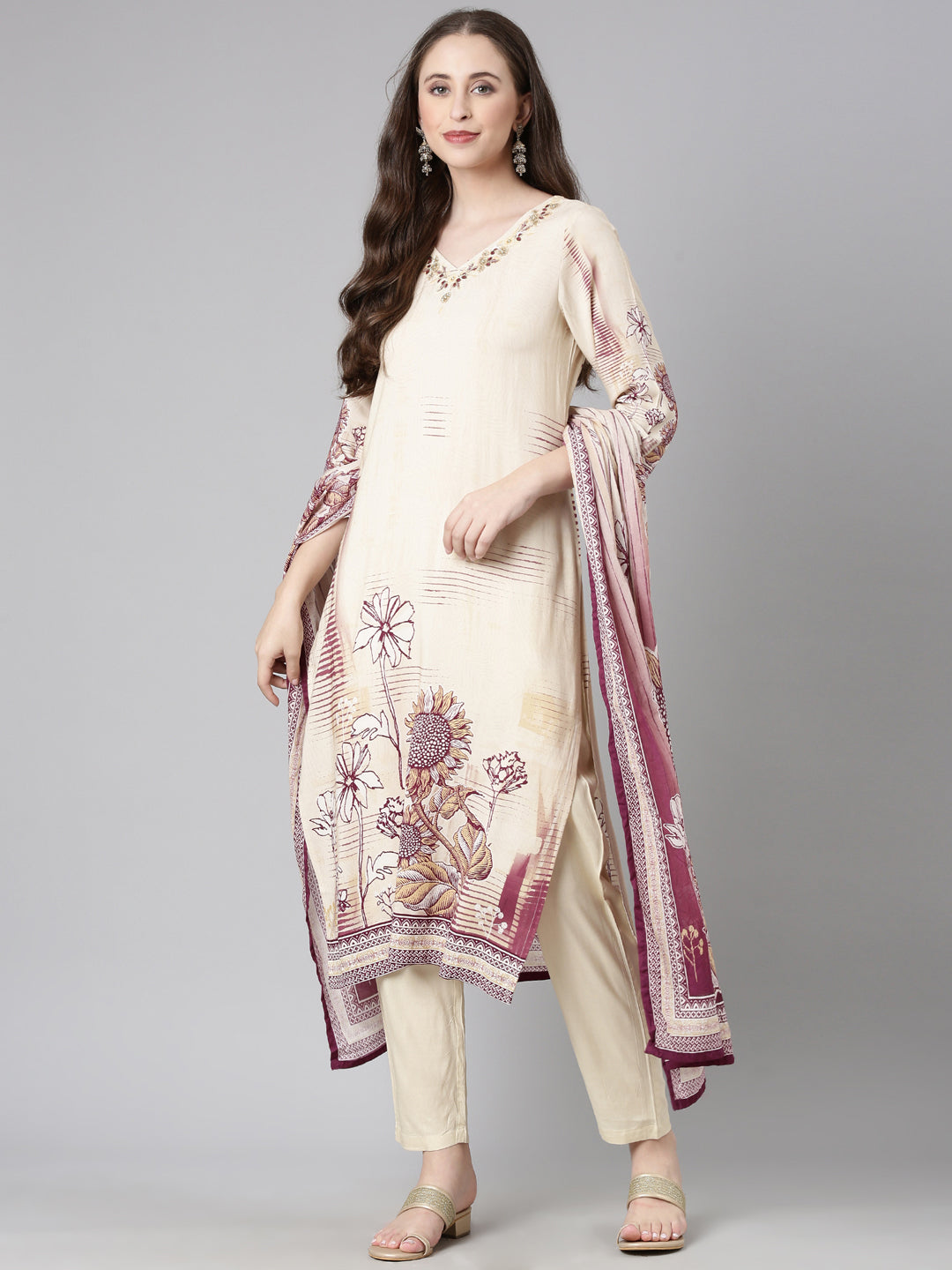 The Neerus Magenta Printed Straight Kurta and Trousers set, accompanied by a matching dupatta, exemplifies expert craftsmanship and elegant design. The straight kurta features intricate prints on a vibrant magenta base, delivering a refined and contemporary ethnic look.