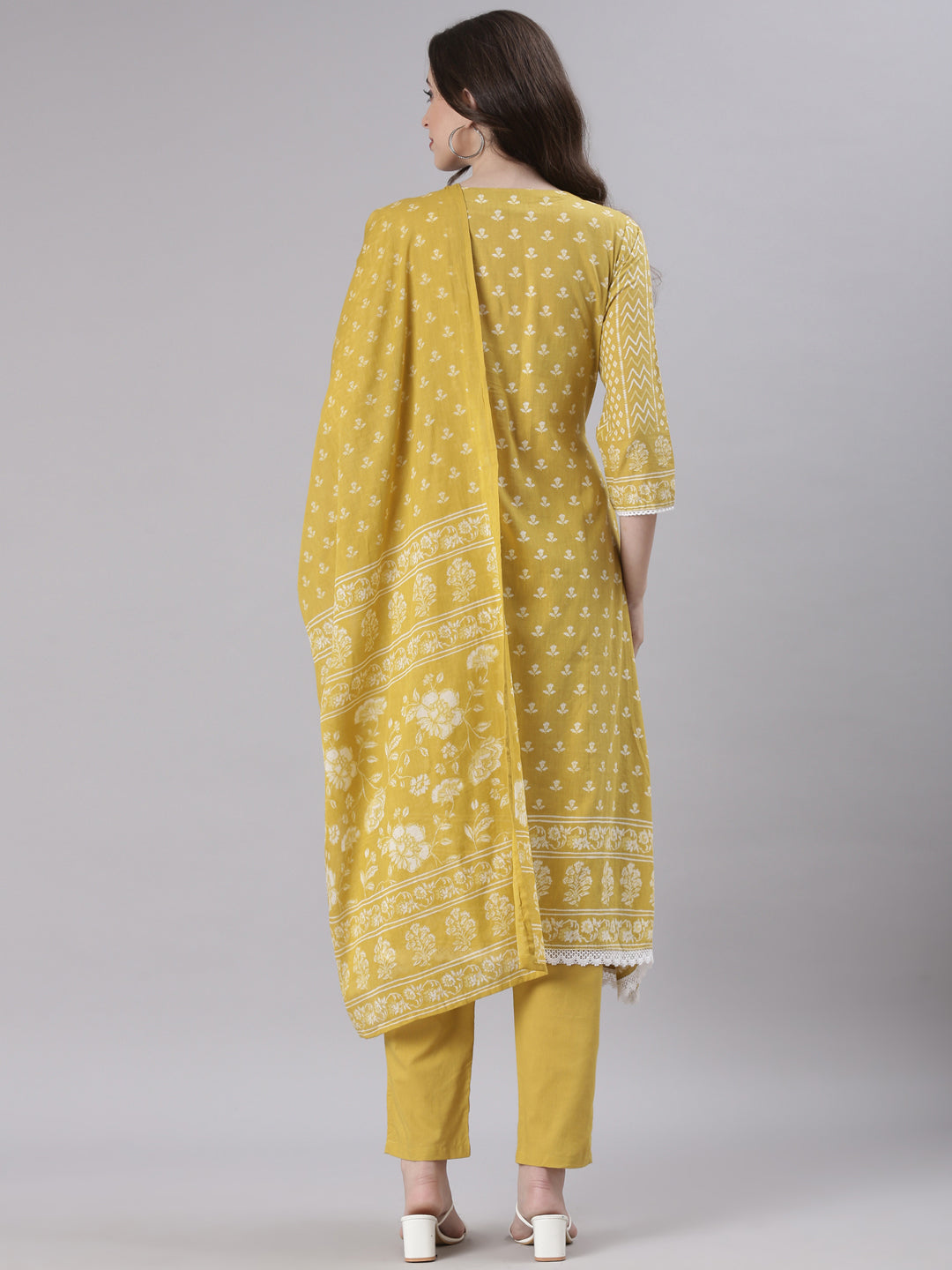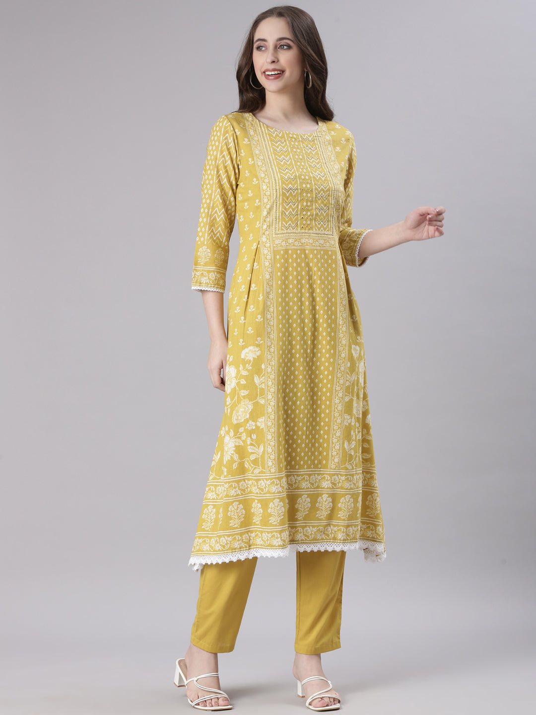 Elevate your ethnic wardrobe with the Neerus Mustard Printed Straight Kurta and Trousers set, complemented by a matching dupatta. This ensemble blends timeless prints with a modern straight cut, offering both style and comfort.