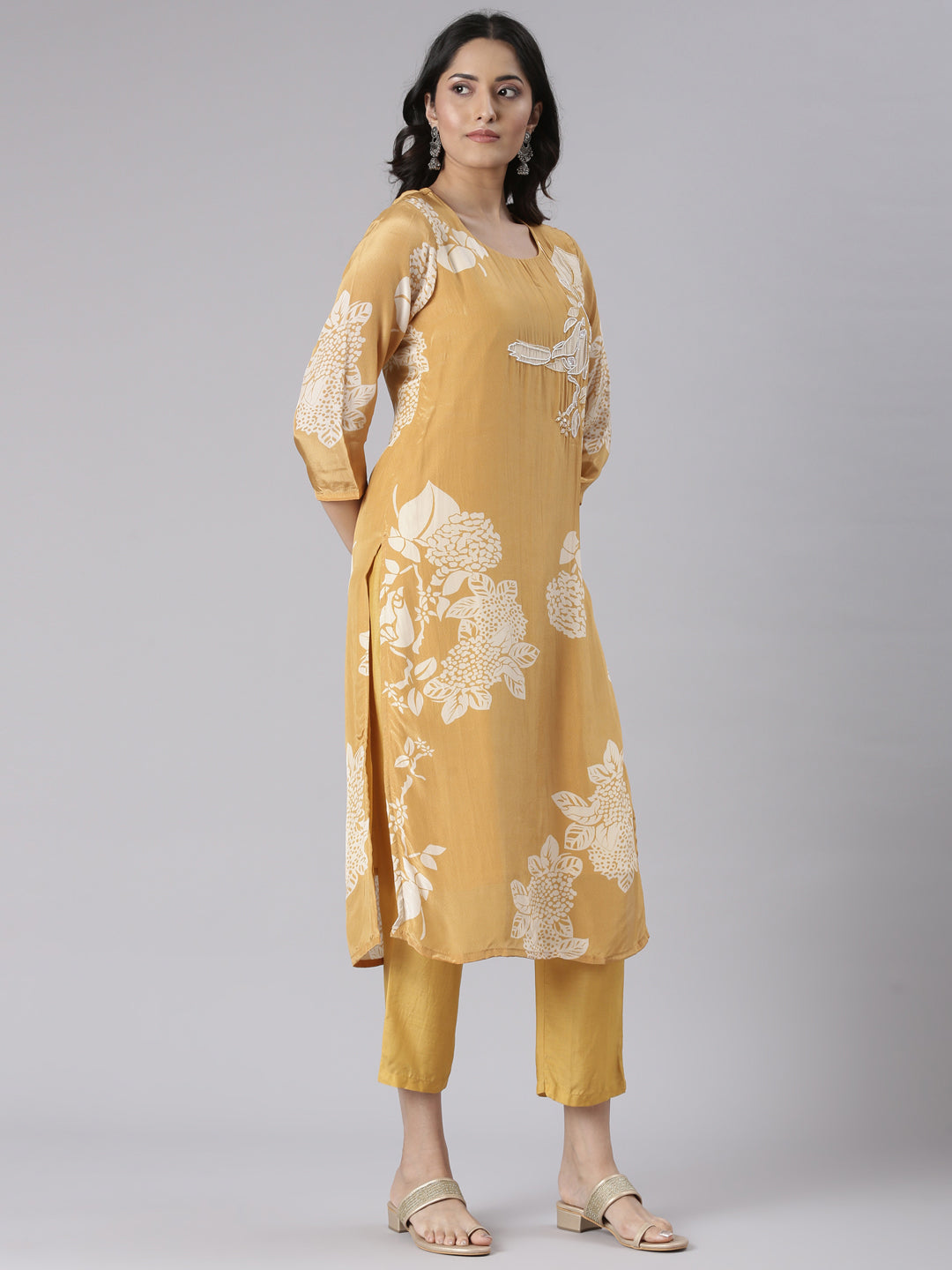 The Neerus Mustard Solid Straight Kurta and Trousers set, paired with a matching dupatta, offers a harmonious blend of classic style and modern refinement. The mustard color adds a rich, warm touch, while the straight cut kurta provides a clean, elegant silhouette.