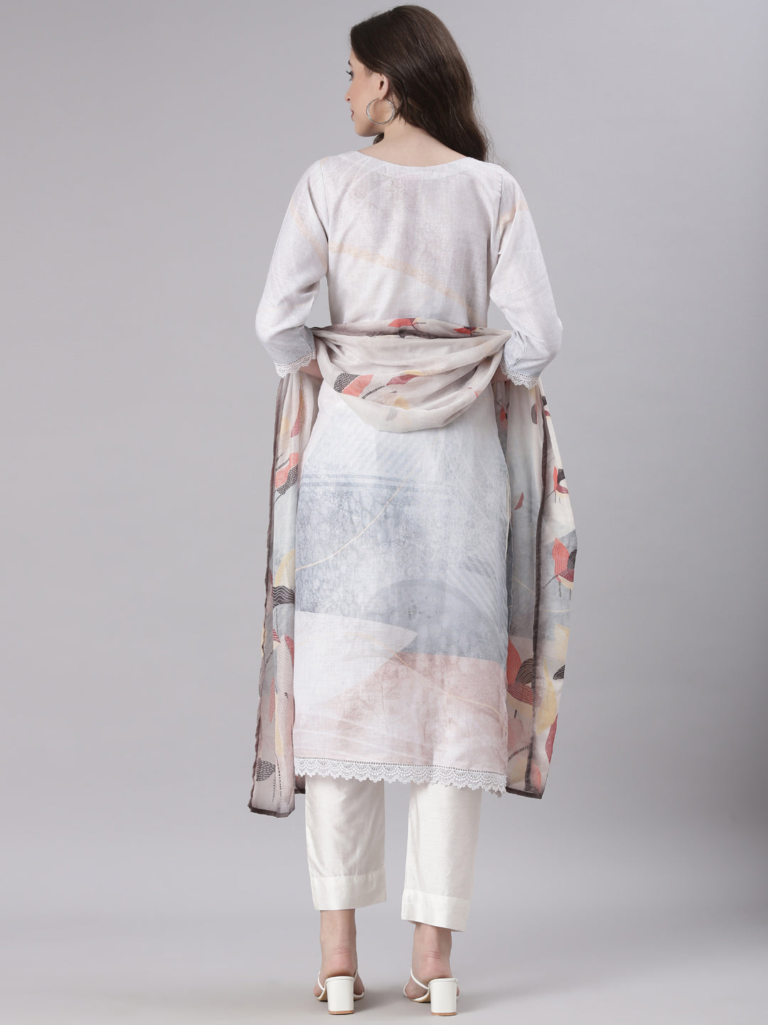 Neerus Off White Solid Straight Kurta and Trousers With Dupatta