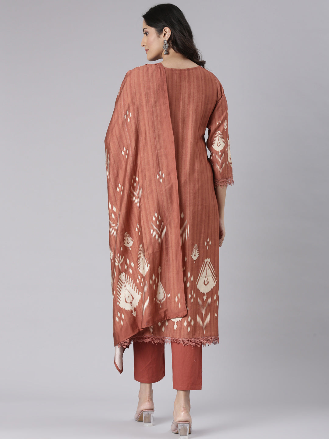 The Neerus Rust Solid Straight Kurta and Trousers set with matching dupatta brings together classic design and modern elegance. Its rich rust shade enhances the sleek, straight-cut silhouette, delivering a polished and sophisticated look. Perfect for formal gatherings or refined casual wear, this ensemble combines comfort and style seamlessly.