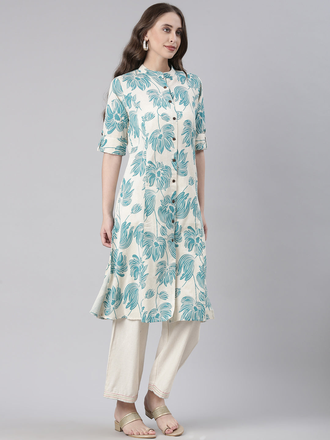Elevate your everyday wardrobe with the Neerus Sea Green Casual Floral Straight Kurtas. Crafted in a soothing sea green shade, this kurta features delicate floral patterns that add a refined touch to casual wear.