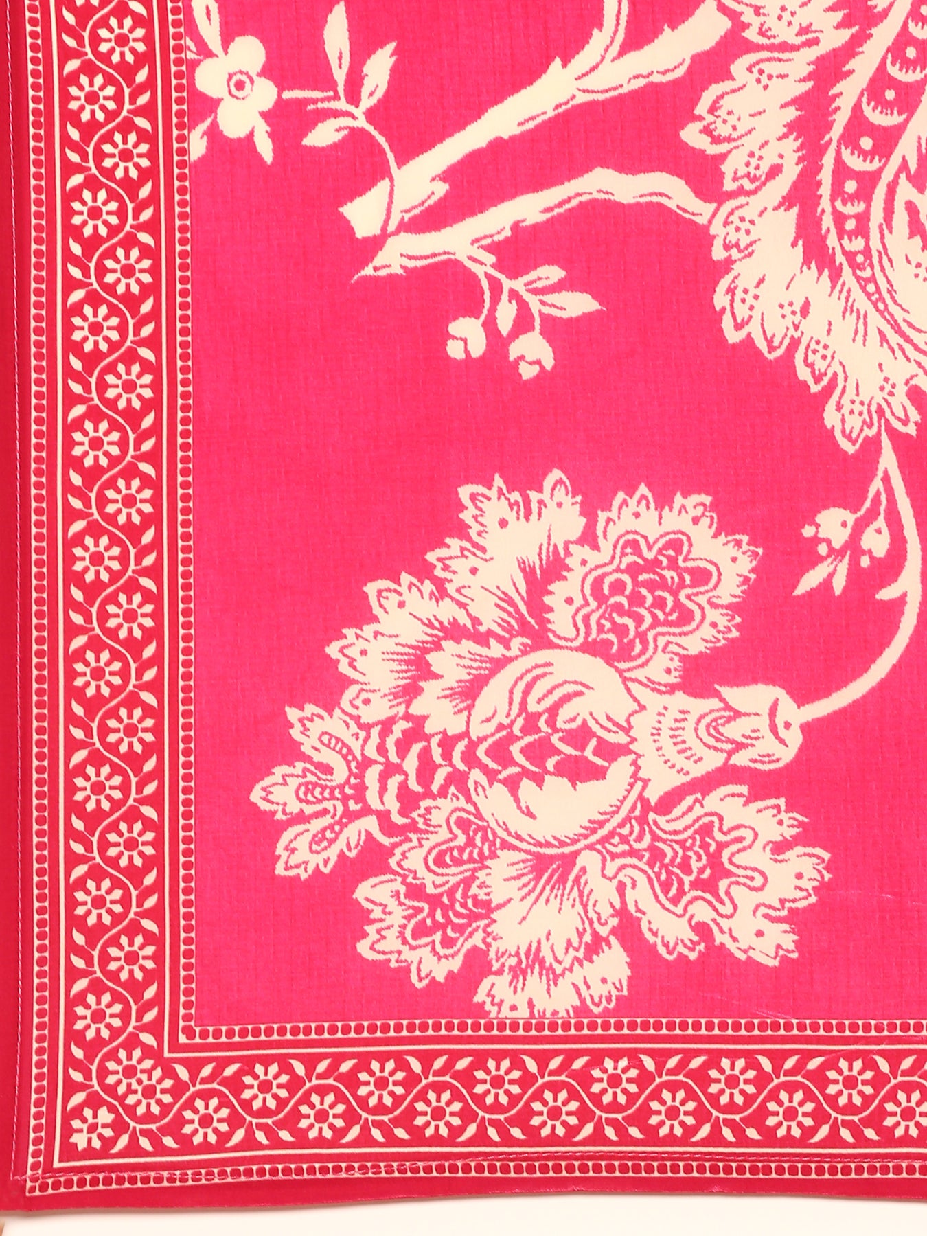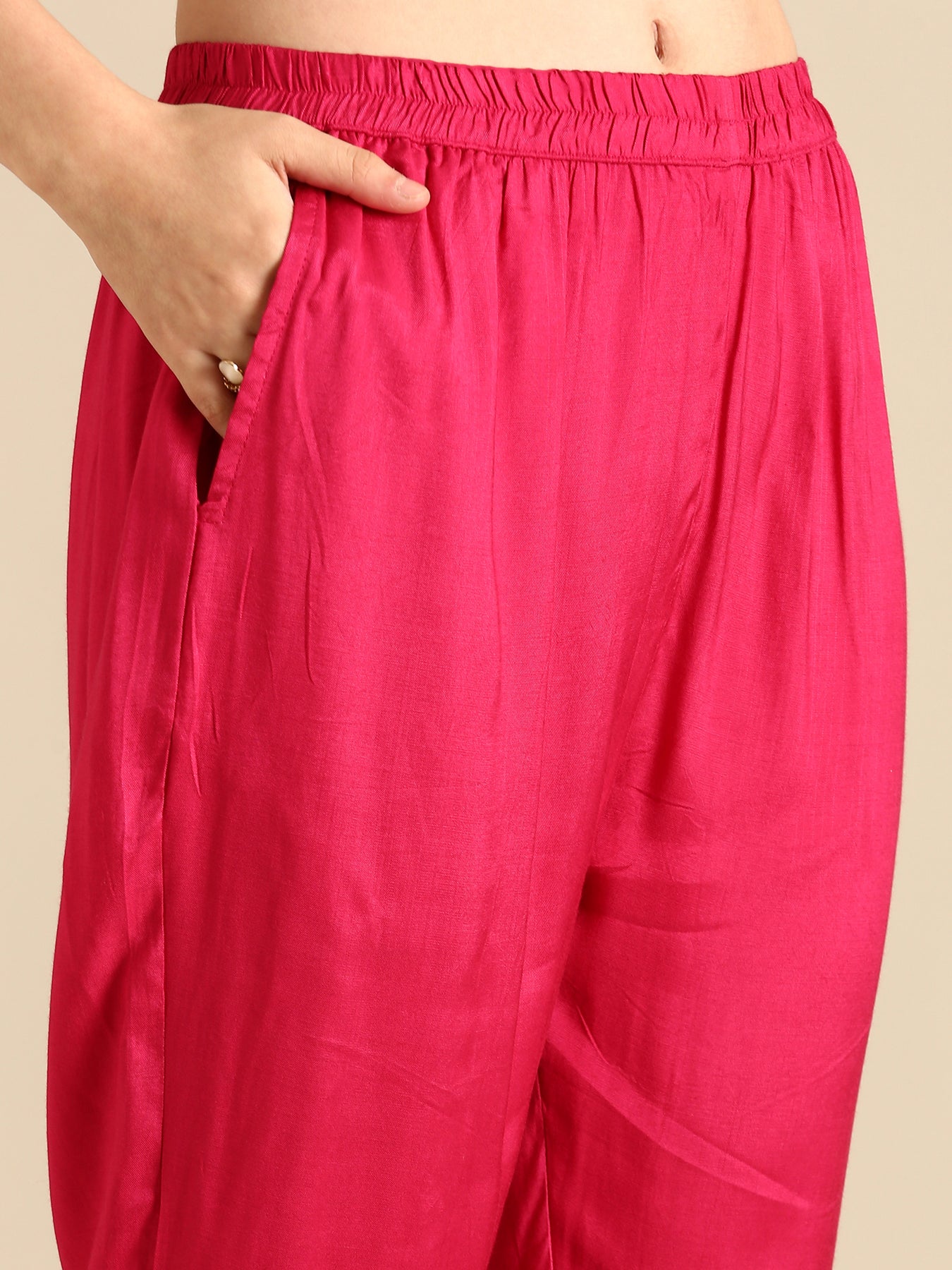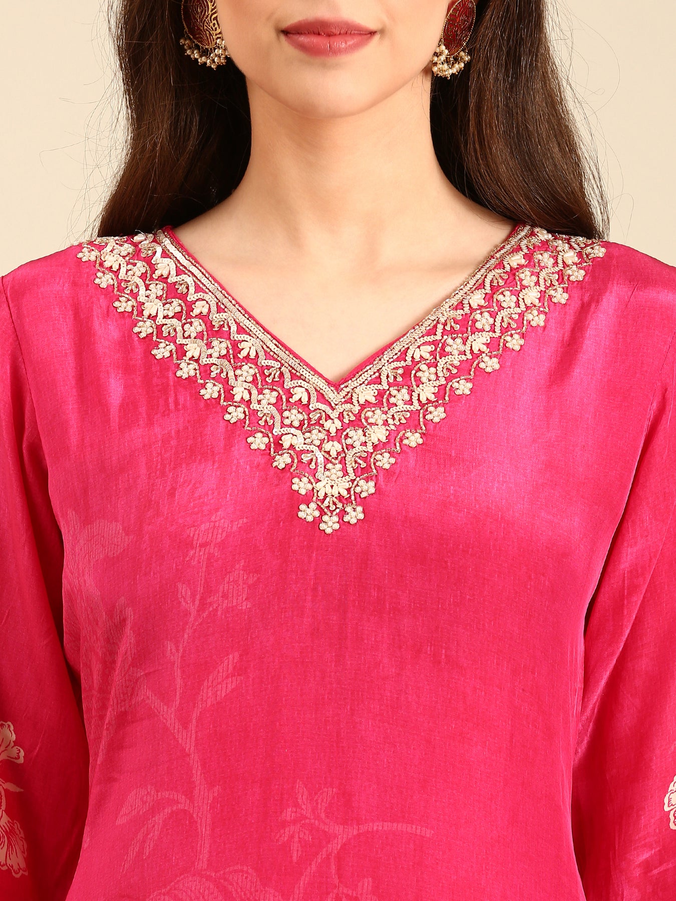 This Pink Crepe Floral Print Three Piece Suit Set showcases a sophisticated design in rich rani crepe fabric with a digitally printed floral pattern. The V-neck Kardhana is elegantly adorned with subtle sequins and moti work, adding refined texture and shimmer. Perfect for formal occasions, this ensemble combines traditional artistry with contemporary style for a graceful and polished appearance.
