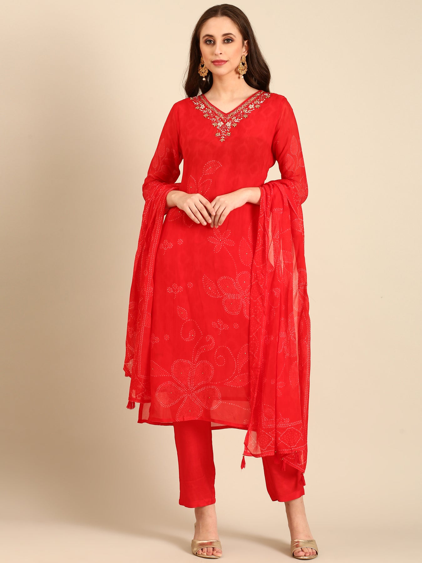 Elevate your wardrobe with this Red Handed Embroidery 3-piece suit set featuring an exquisite organza flower bandhani print. The V-neck design is enhanced with delicate zari embroidery and adorned with intricate kardhana beadwork, blending traditional craftsmanship with modern elegance. Perfect for special occasions, this set offers a refined and graceful silhouette that speaks of timeless sophistication.