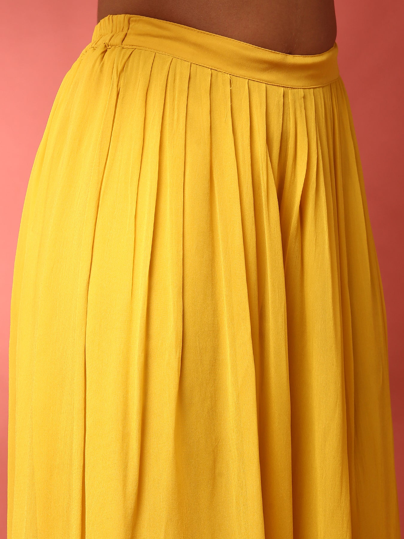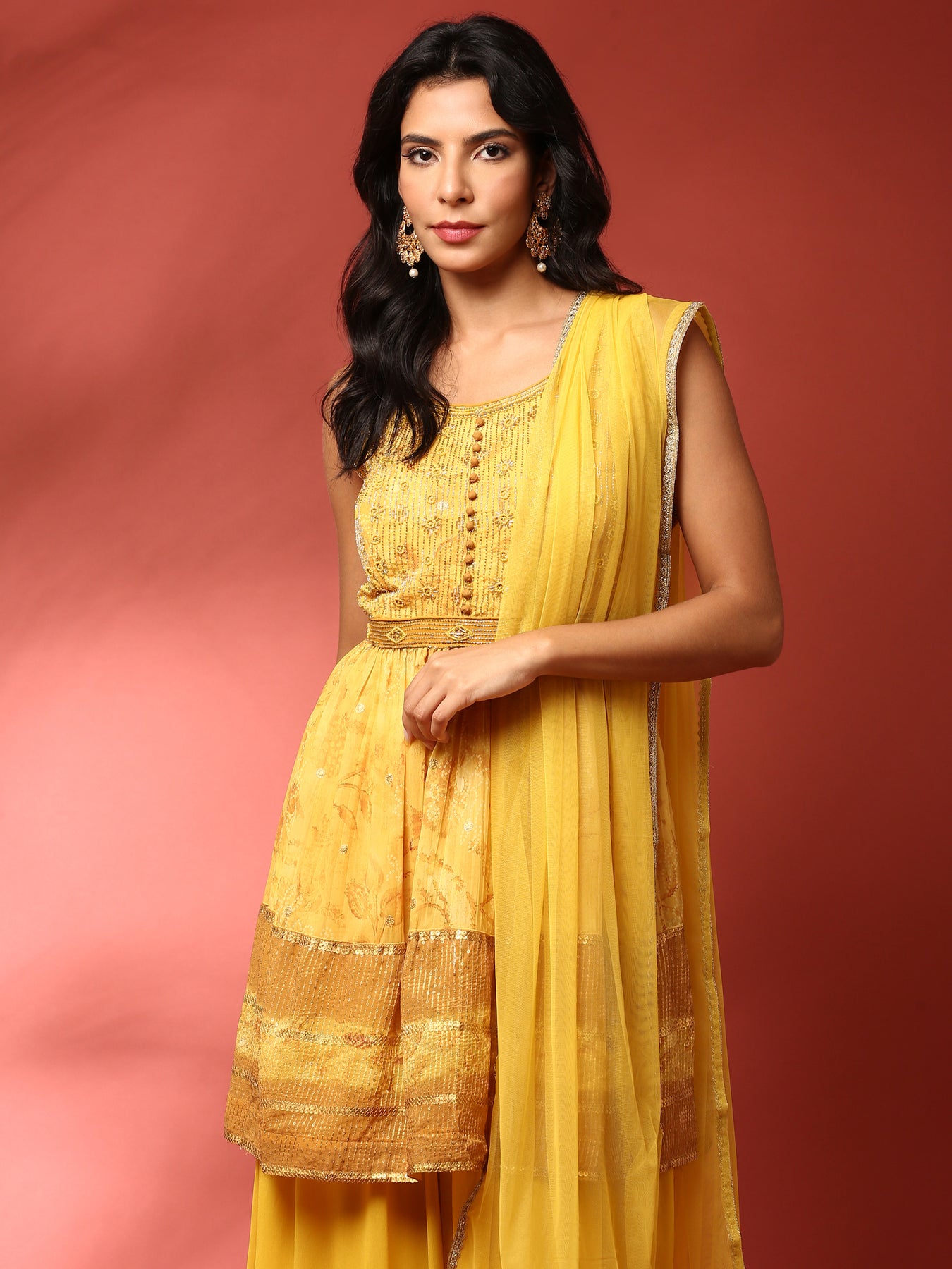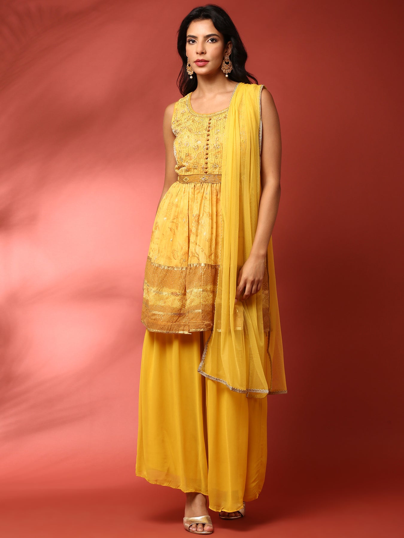 Elevate your wardrobe with this sophisticated three-piece set crafted from yellow georgette. Featuring an intricately embroidered peplum top paired with flowing palazzo pants, this ensemble blends elegance and comfort effortlessly. Perfect for festive occasions or stylish gatherings, its breathable fabric and refined detailing ensure you stand out with graceful charm.