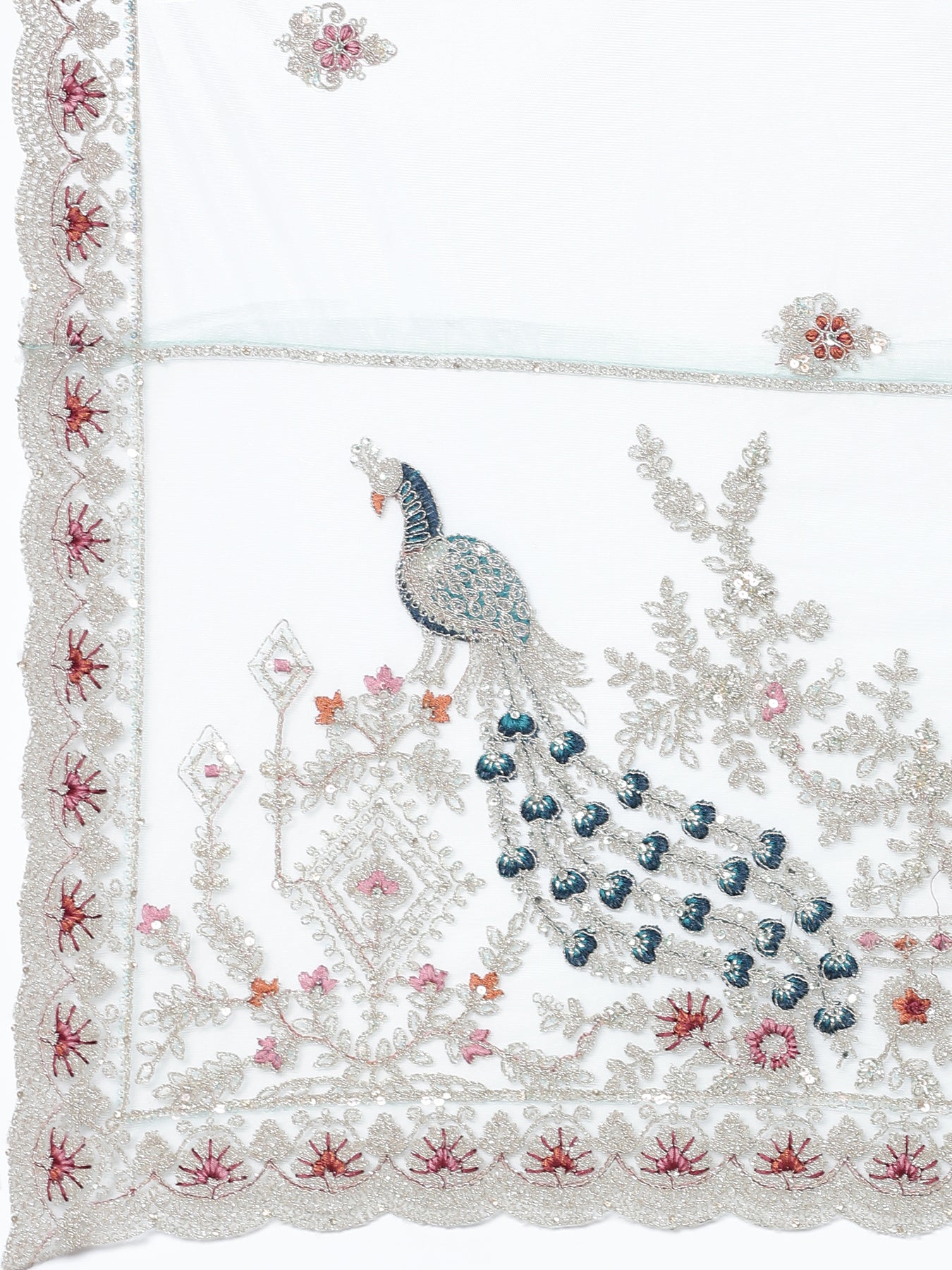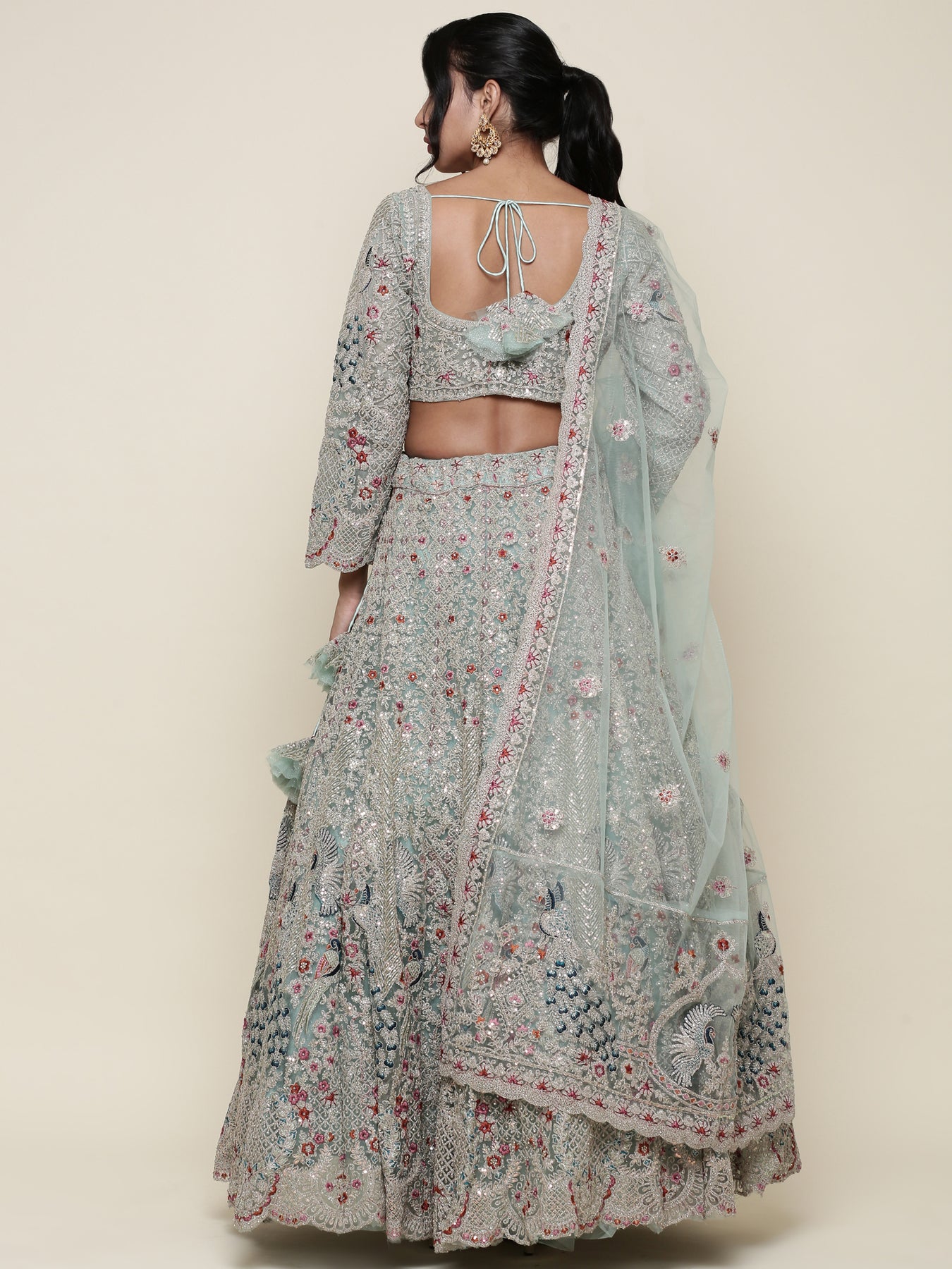Elevate your traditional wardrobe with this sea green net three-piece ghagra set, expertly crafted with intricate heavy embroidery. The delicate net fabric lends an ethereal feel, while the detailed embellishments add a rich, sophisticated touch. Perfect for festive occasions and weddings, this ensemble balances elegance and grandeur, ensuring a striking presence with every wear.