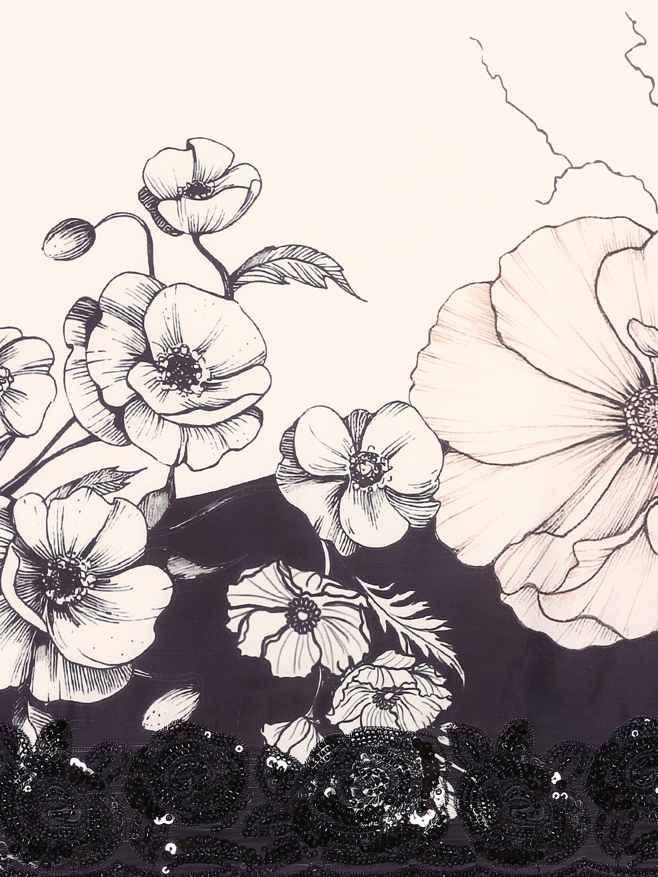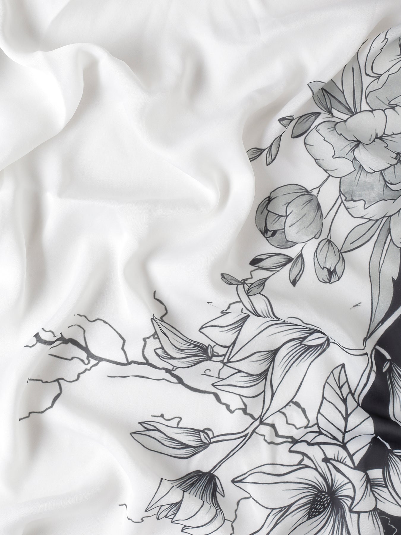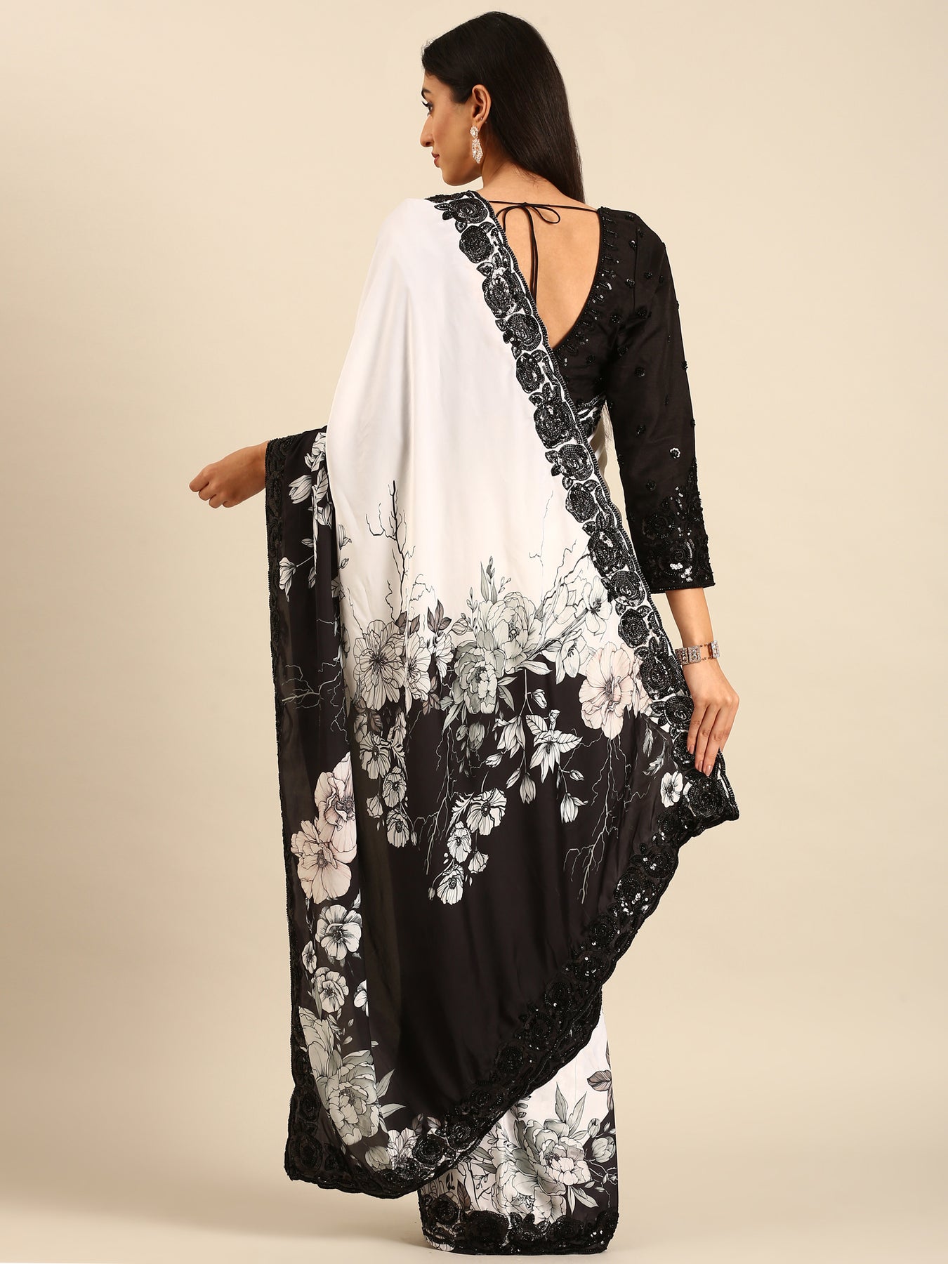 This elegant black and white satin saree features exquisite hand embroidery that adds a refined touch to its printed design. Crafted from smooth satin, it drapes beautifully, offering both comfort and style. The saree comes with a ready-made blouse, ensuring a perfect match and ease of wear for any special occasion.