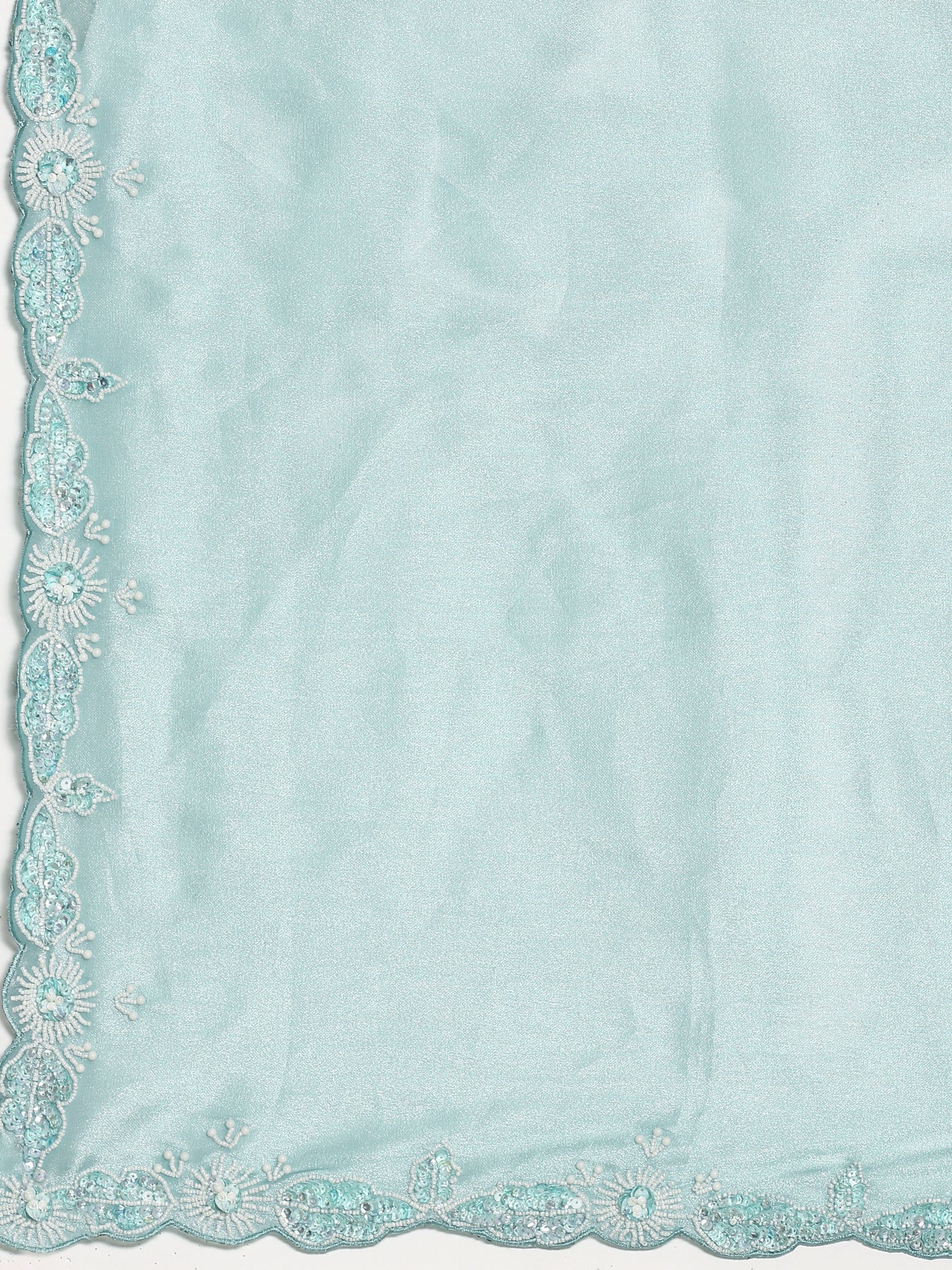 Elevate your ethnic wardrobe with this Blue Jimmy Satin Tissue Saree featuring exquisite pearl and sequin embroidery. The delicate embellishments add subtle sparkle, perfectly complementing the luxurious satin tissue fabric for a graceful drape. It comes with a ready-made blouse, ensuring a seamless look and comfortable fit. Ideal for festive occasions and celebrations, this saree combines traditional craftsmanship with modern elegance for a distinguished appearance.