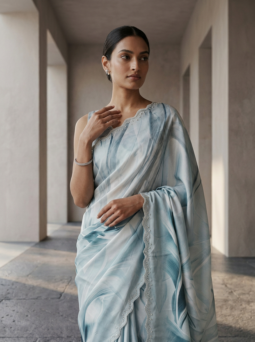 Ice Blue Satin Abstract Printed Saree