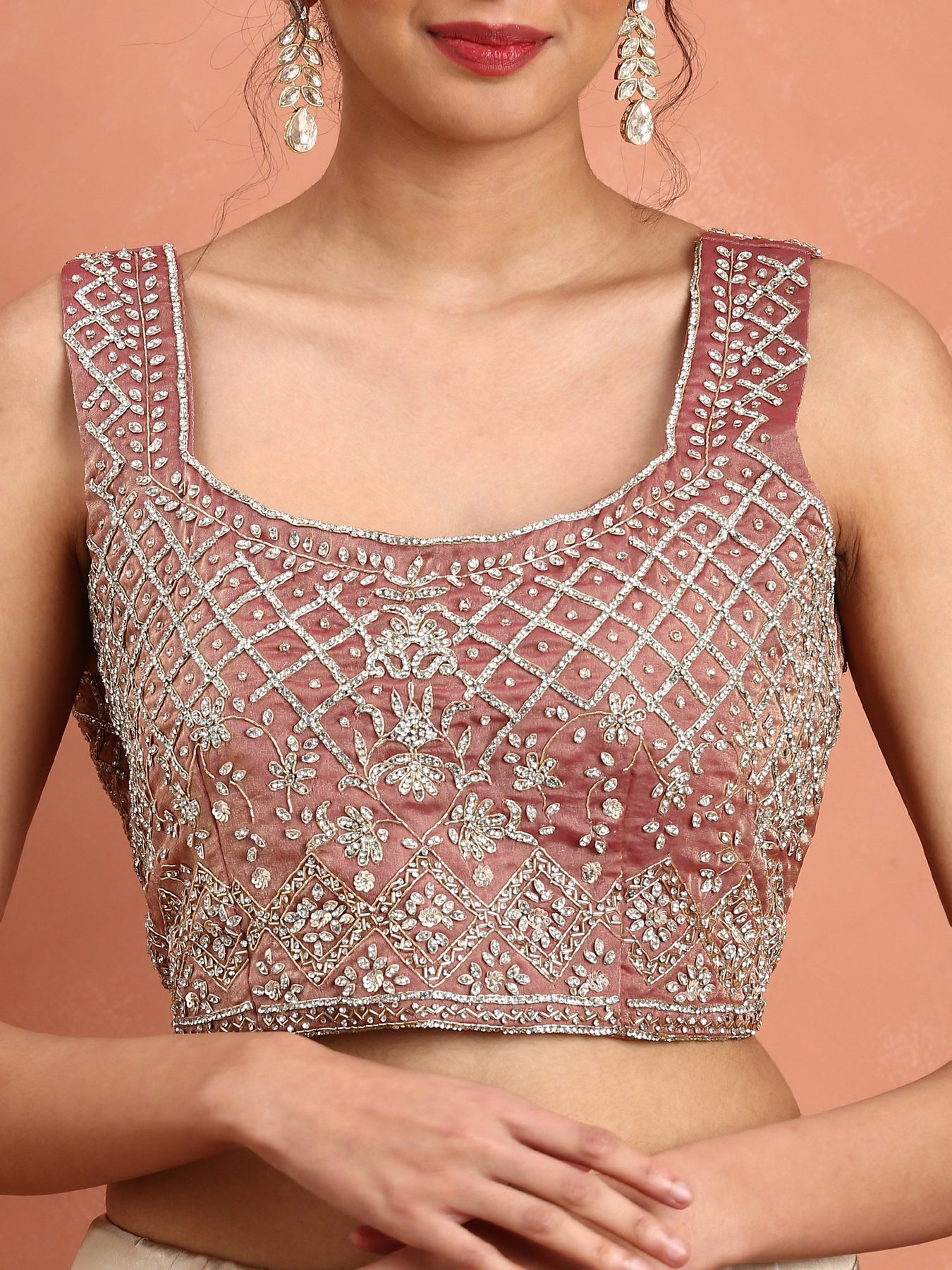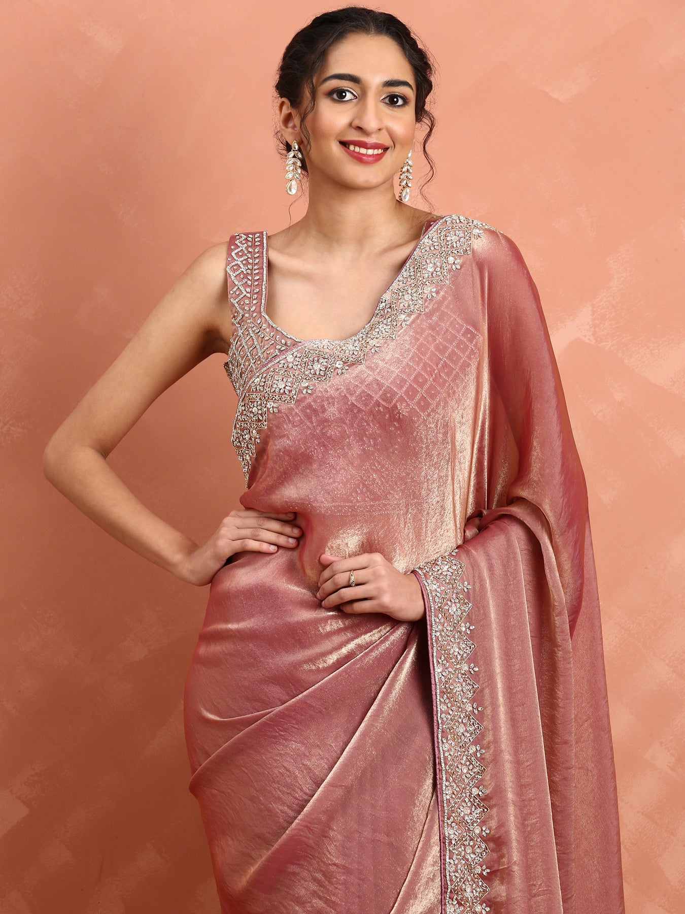 This elegant onion pink tissue saree features intricate Swarovski crystal and cut Dana embroidery, adding a subtle yet captivating shimmer to the fabric. Crafted from lightweight tissue material, it drapes gracefully for a refined silhouette. The saree includes a ready-made blouse tailored to complement the design, ensuring a seamless and sophisticated ensemble perfect for special occasions.