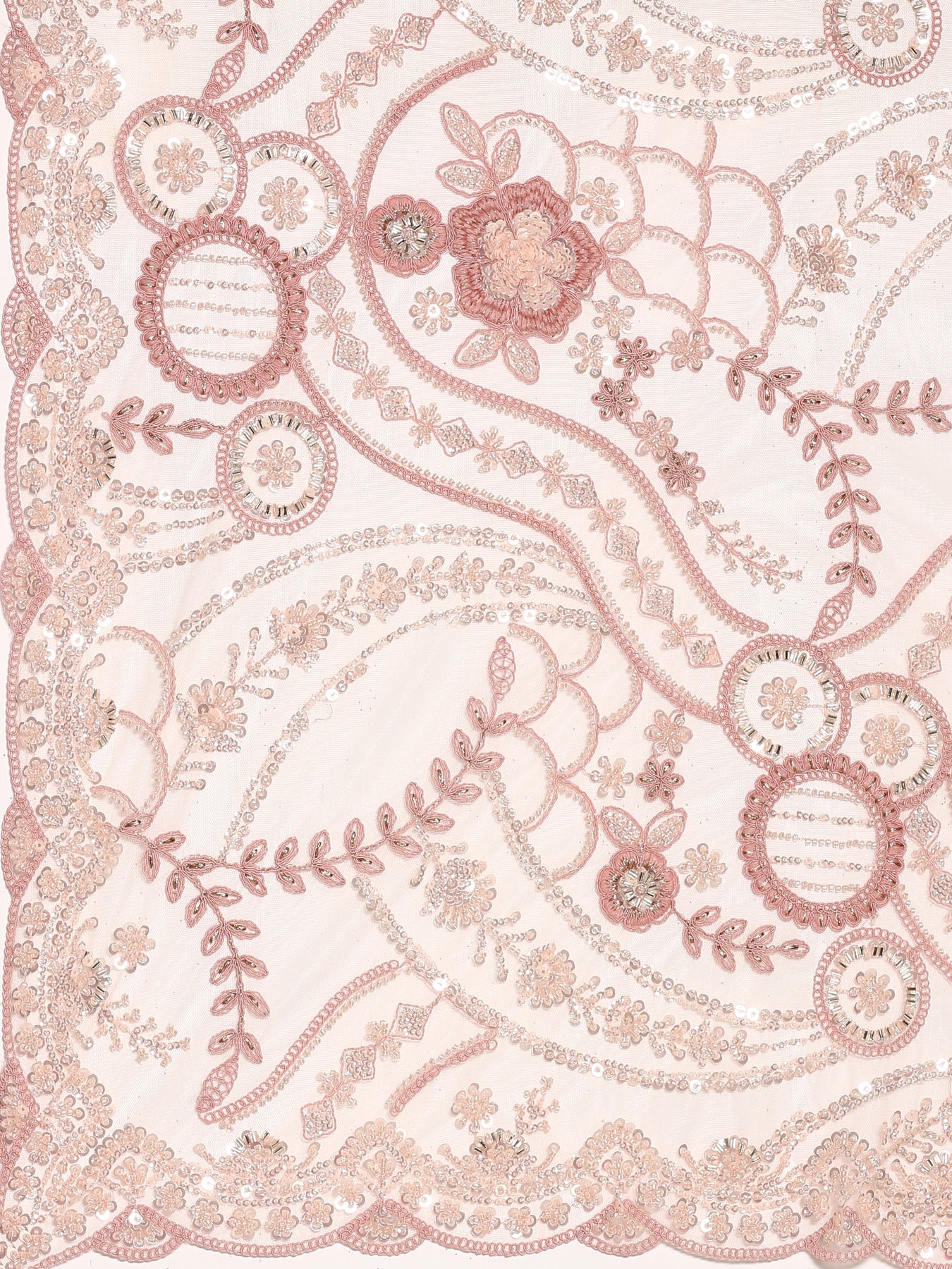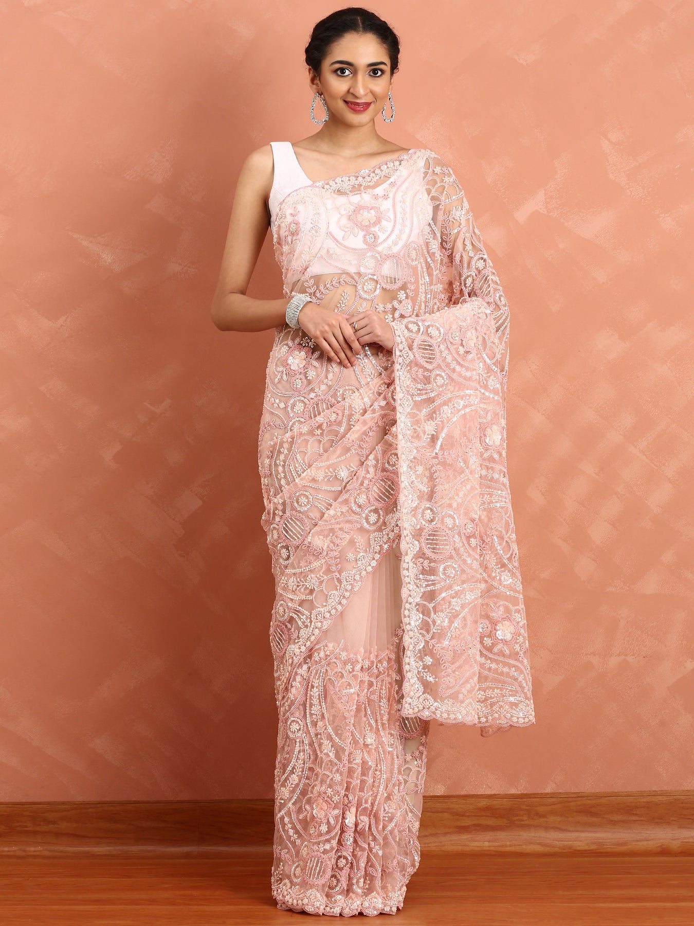 This elegant peach net saree features exquisite hand embroidery adorned with delicate pearls and shimmering sequins, enhancing its graceful appeal. The scallop border adds a refined finish, making it a perfect choice for sophisticated occasions where subtle glamour is desired.
