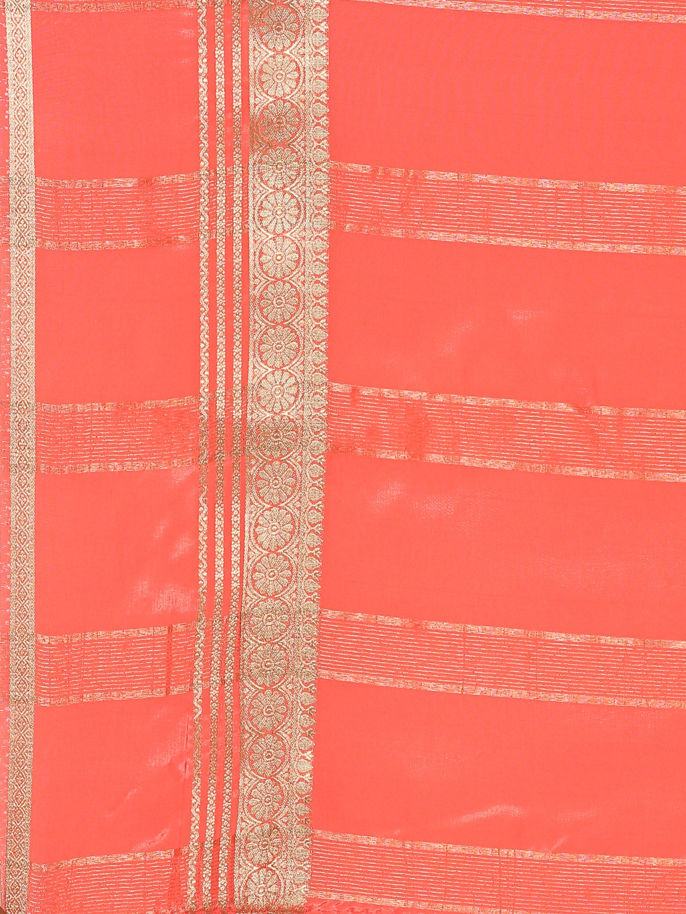 Discover the elegance of the Pink Mysore crepe saree, featuring a refined Zari contrast border that adds a timeless charm. Crafted from smooth Mysore crepe, this saree drapes beautifully, offering both comfort and a graceful silhouette. Ideal for formal occasions, its understated sophistication enhances your presence with subtle luxury.