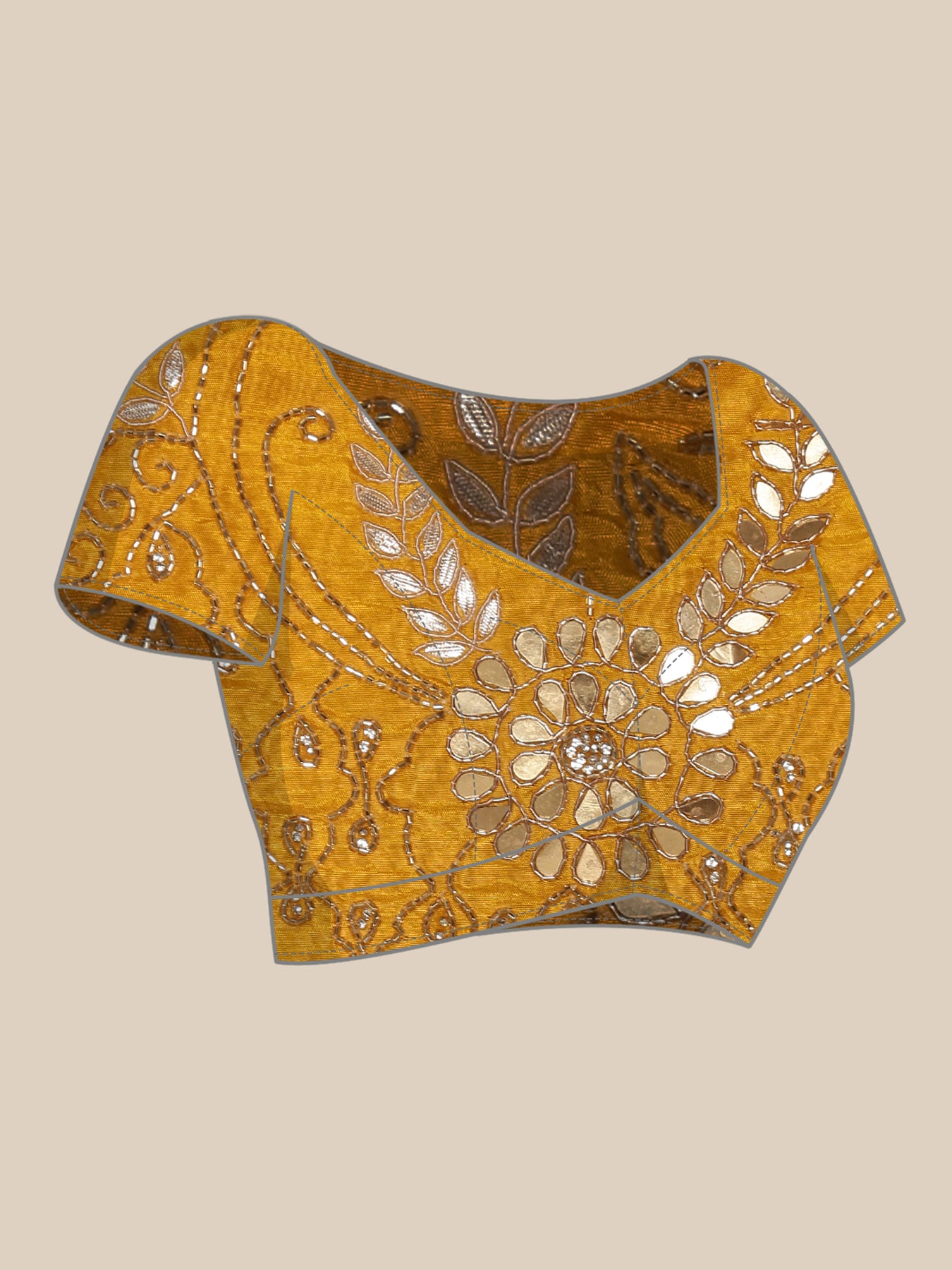 The saree is accompanied by a stylish, ready-made blouse designed to complete your look.