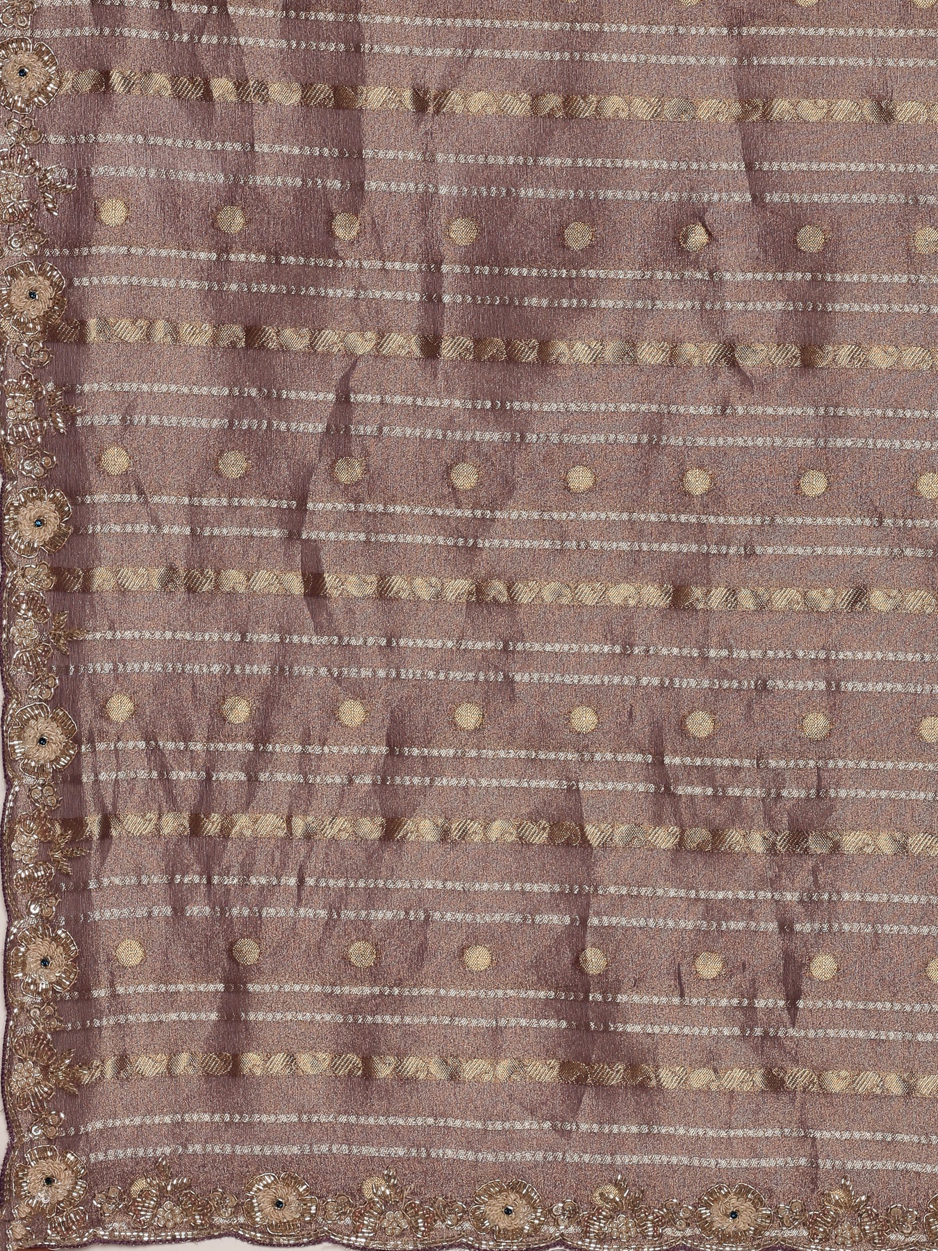 Elevate your elegance with this purple tissue weaved saree, featuring intricate stone work that adds a subtle shimmer to your ensemble. Paired with a perfectly tailored readymade blouse, it offers both style and convenience. Ideal for special occasions, this saree blends traditional craftsmanship with refined sophistication for a timeless look.