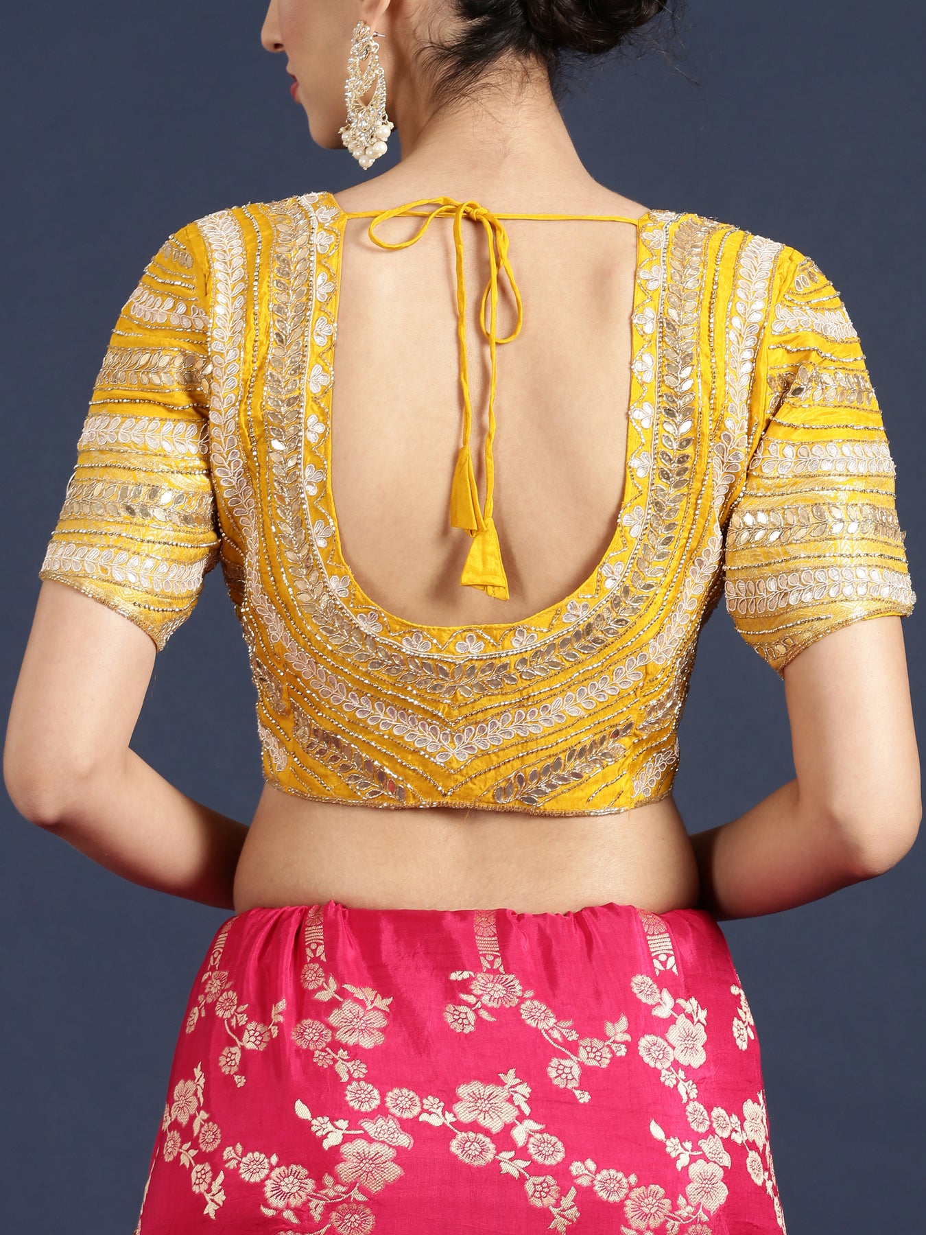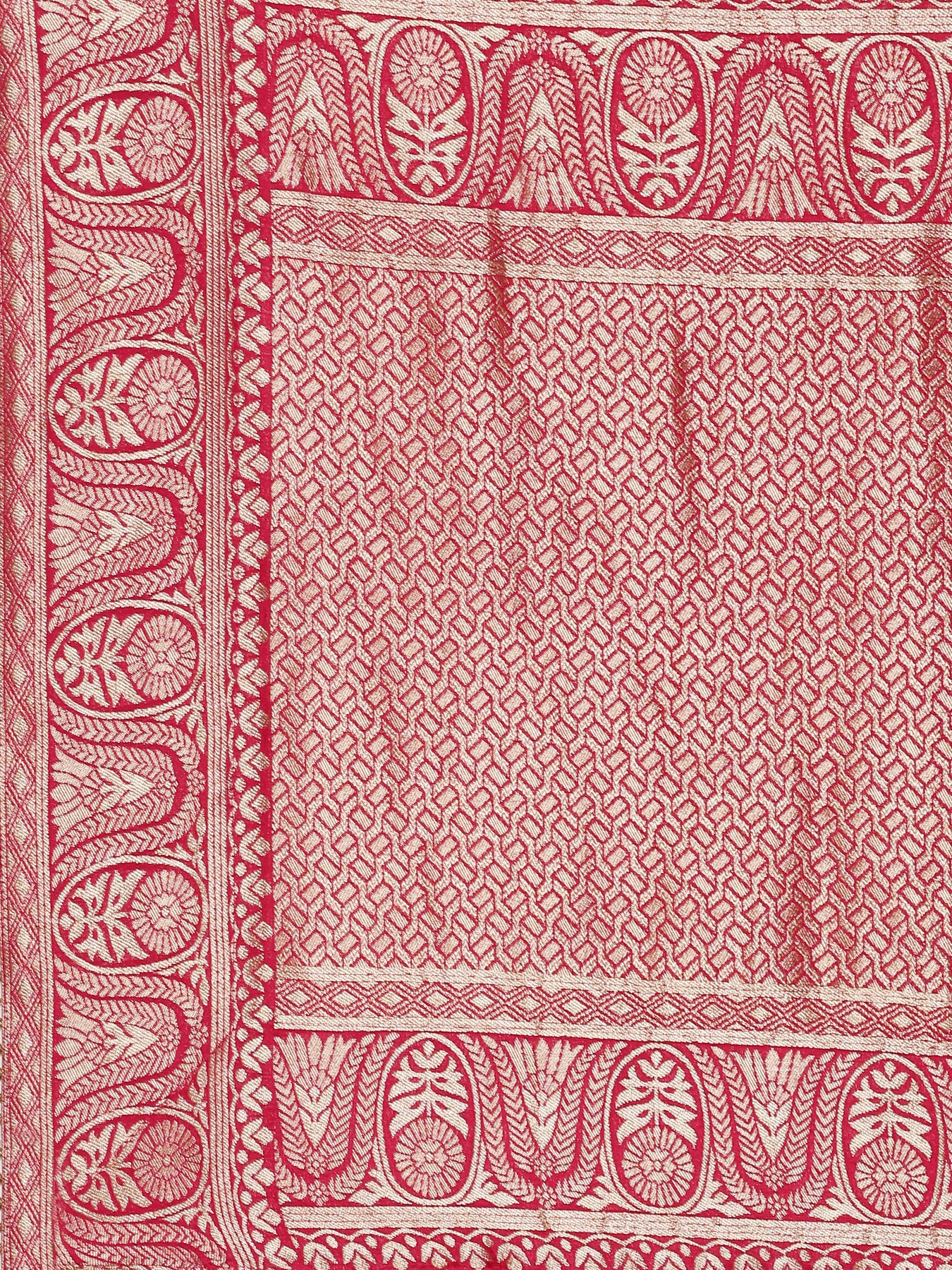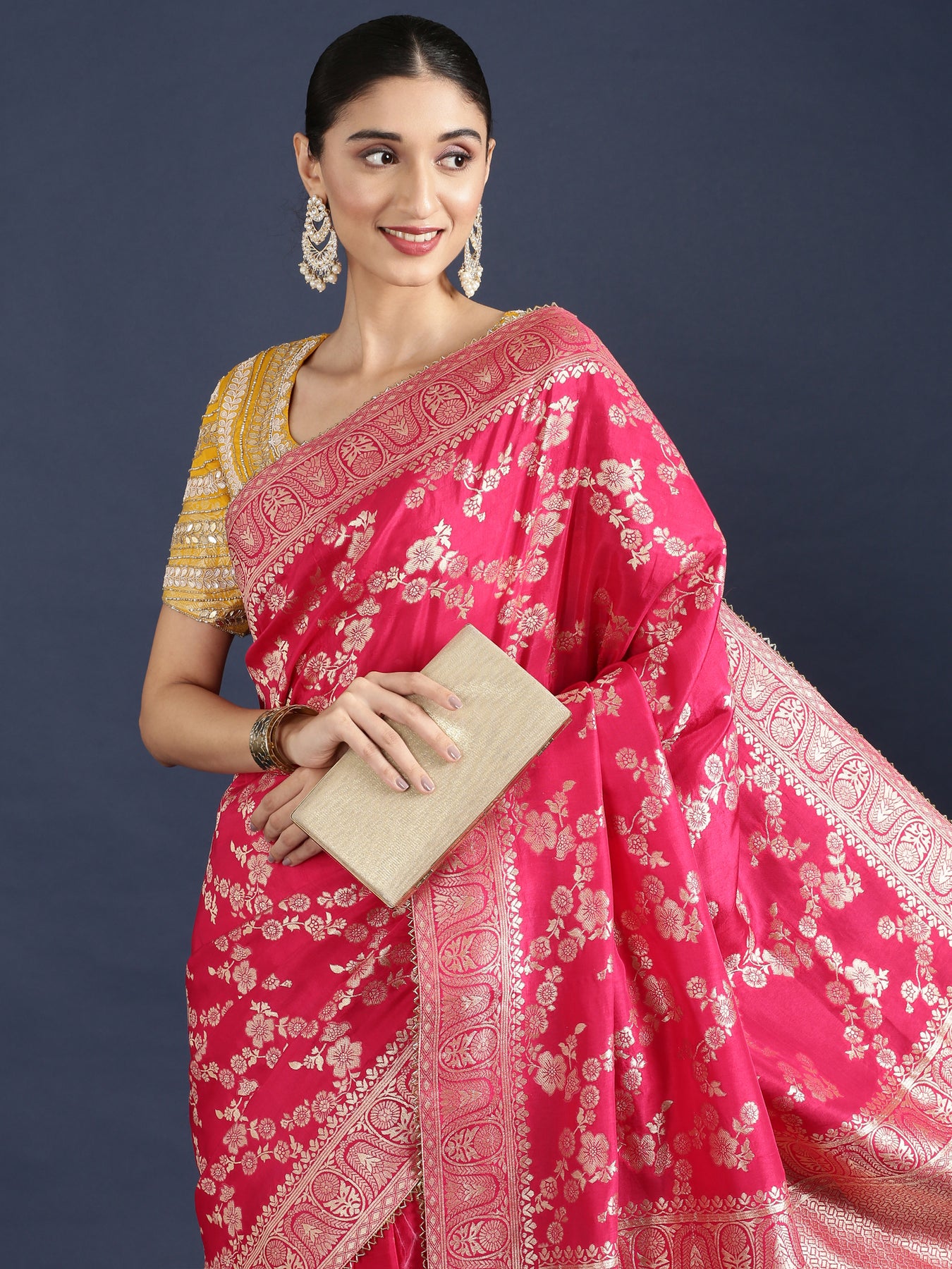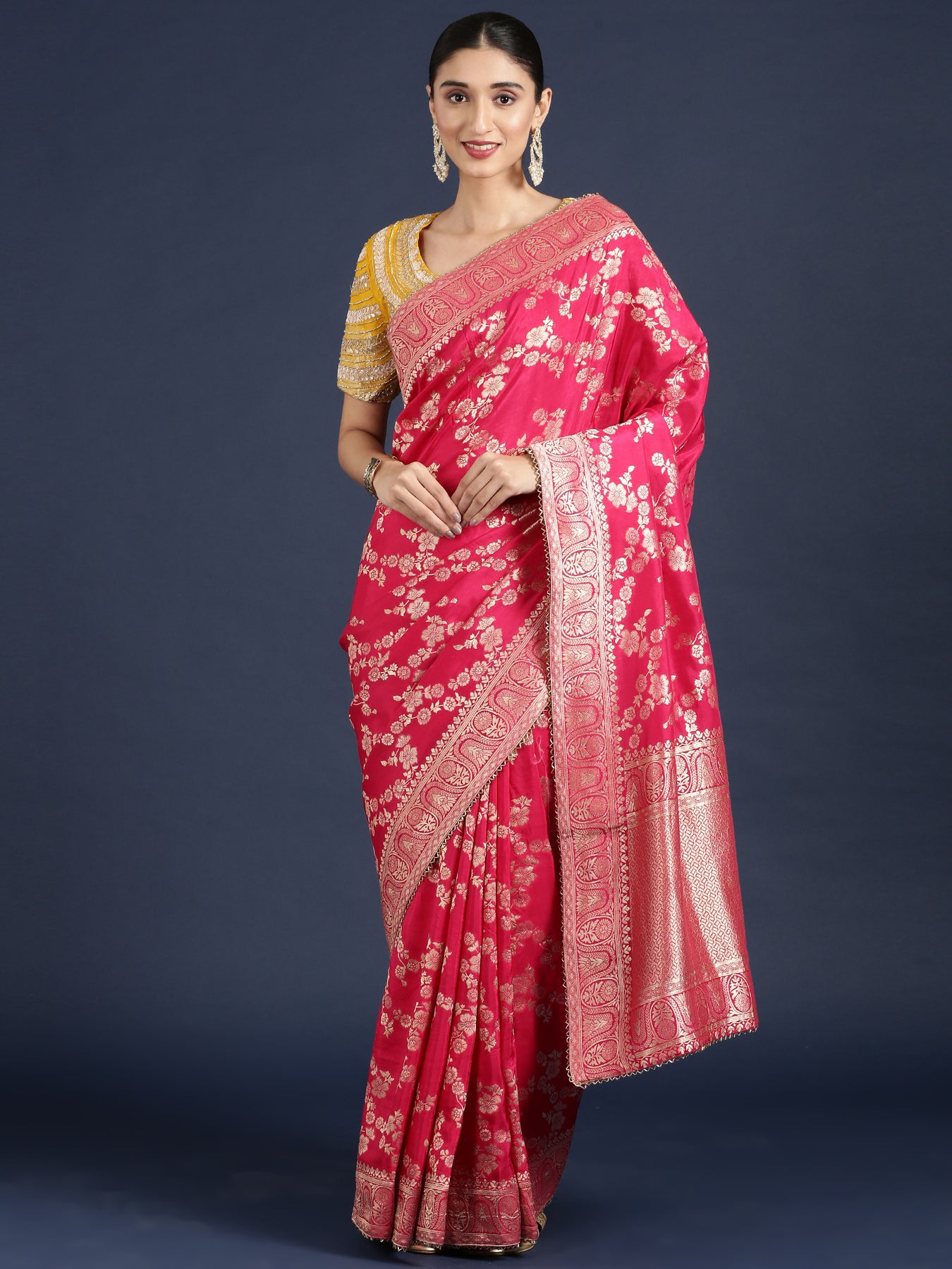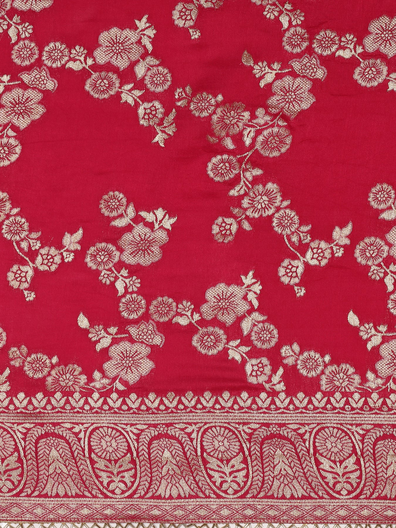Elevate your ensemble with this exquisite Rani Pink Banaras weaved saree, featuring intricate embroidery that adds a touch of timeless elegance. Crafted with rich fabric and detailed weaving, it comes paired with a ready-made blouse to ensure a perfect fit and effortless style. Ideal for special occasions, this saree combines classic charm with sophisticated craftsmanship, making it a stunning addition to your wardrobe.