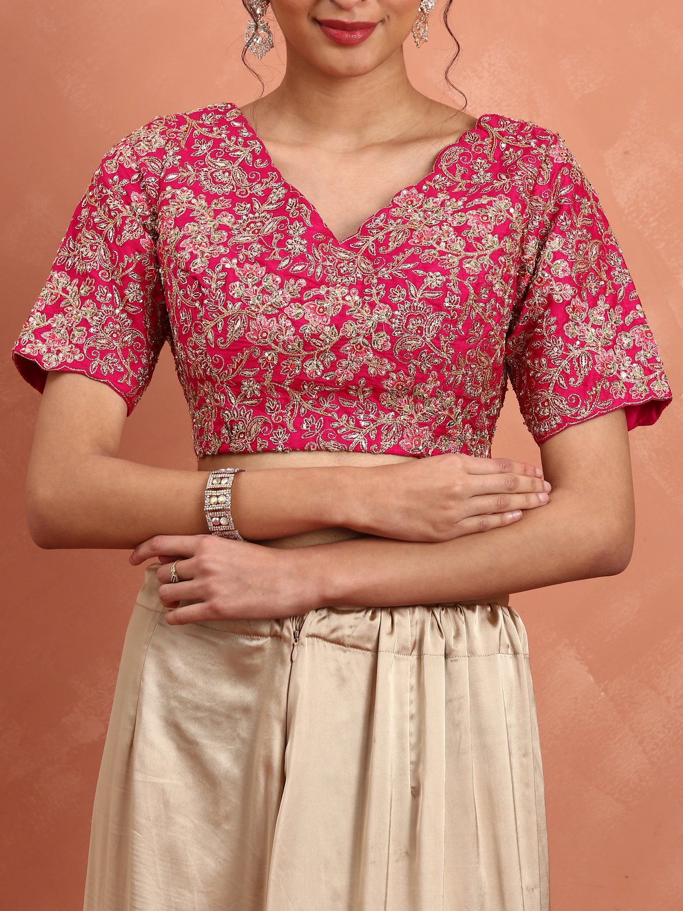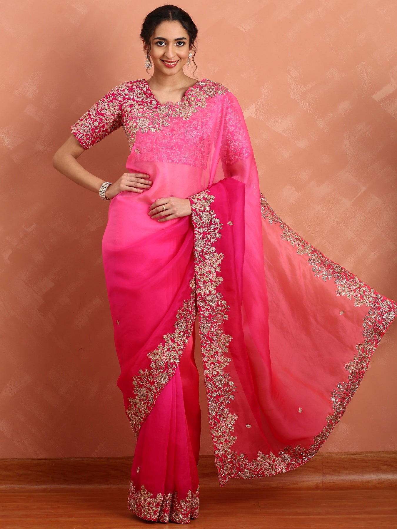 This exquisite rani pink pure organza saree is paired with a richly embroidered heavy blouse, adorned with intricate pearl and cut dana work. The delicate yet structured organza fabric offers a lightweight and elegant drape, while the detailed embroidery enhances its traditional appeal. Perfect for special occasions, this saree combines timeless craftsmanship with refined sophistication.