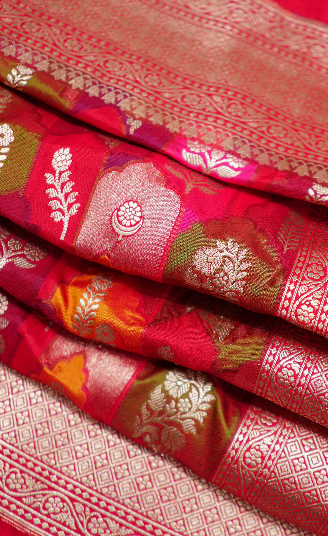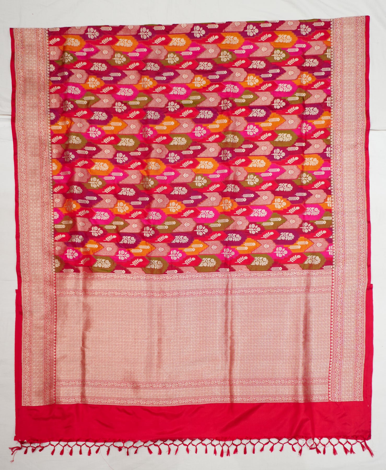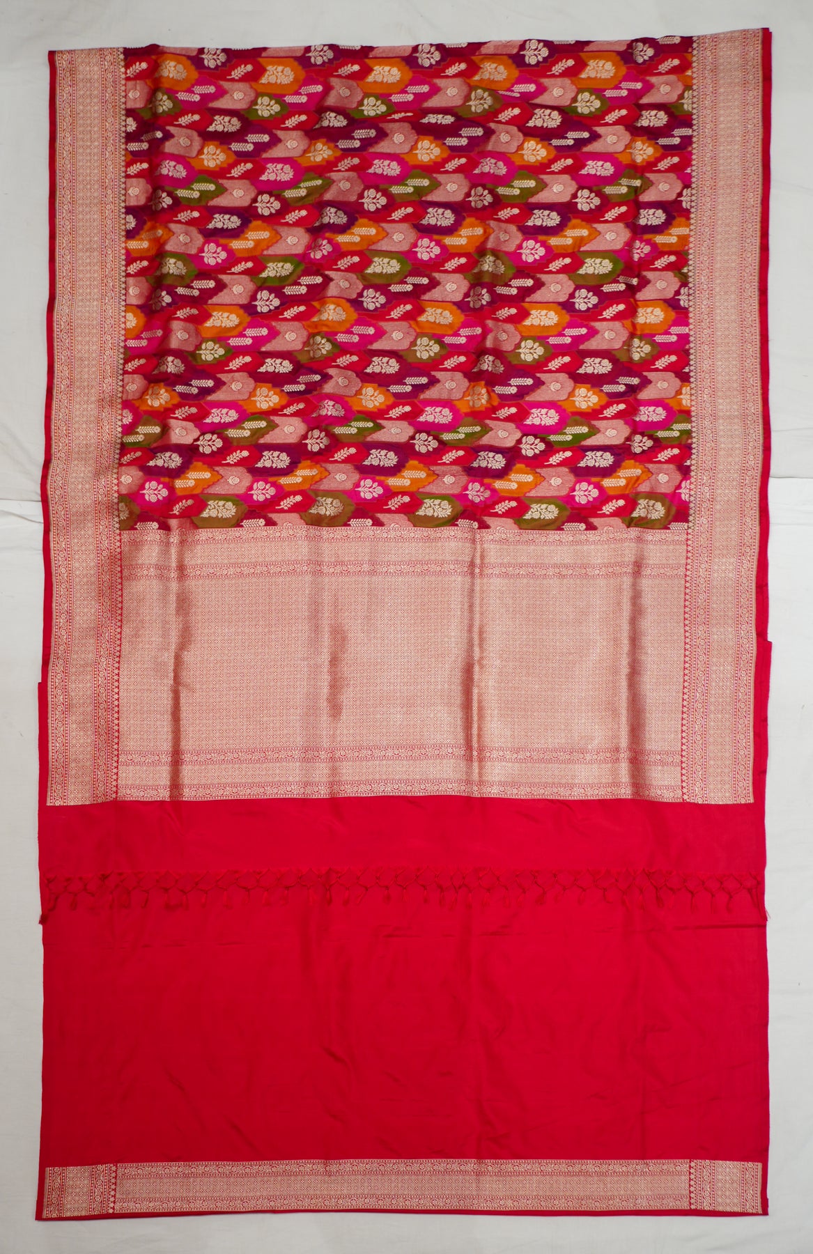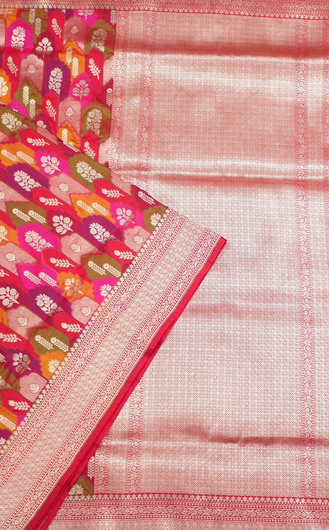 Drape yourself in timeless elegance with this stunning Red Banaras Silk saree, a masterpiece of traditional Indian craftsmanship. Handwoven with meticulous care, this saree features vibrant multicolor zari work that catches light beautifully, adding sophistication to every occasion. The luxurious silk fabric offers a graceful drape and comfortable wear, making it perfect for weddings, festivals, and celebrations. Each piece celebrates authentic weaving heritage while delivering the quality and beauty you deserve. A wardrobe essential that honors tradition with contemporary style.