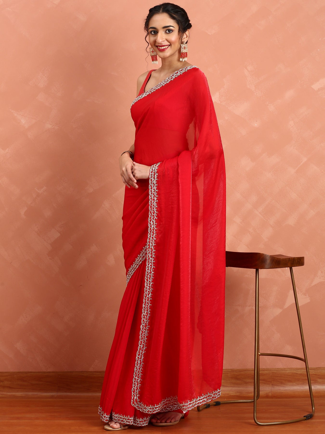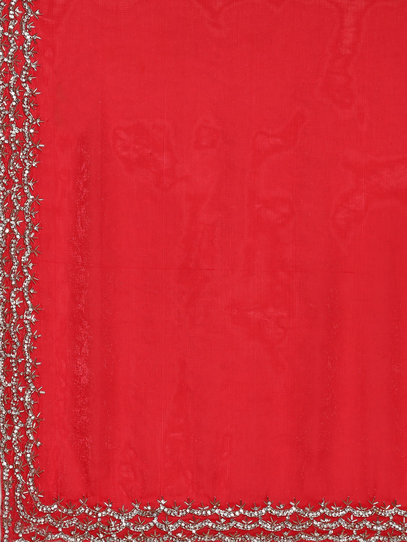 Crafted with precision, this red Jimmy saree features exquisite pearls and intricate cut Dana embroidery. The combination of these artisanal embellishments enhances the saree’s texture and depth, offering a luxurious sheen and sophisticated appeal. Ideal for formal occasions, it embodies refined elegance and showcases expert craftsmanship in traditional Indian textile artistry.