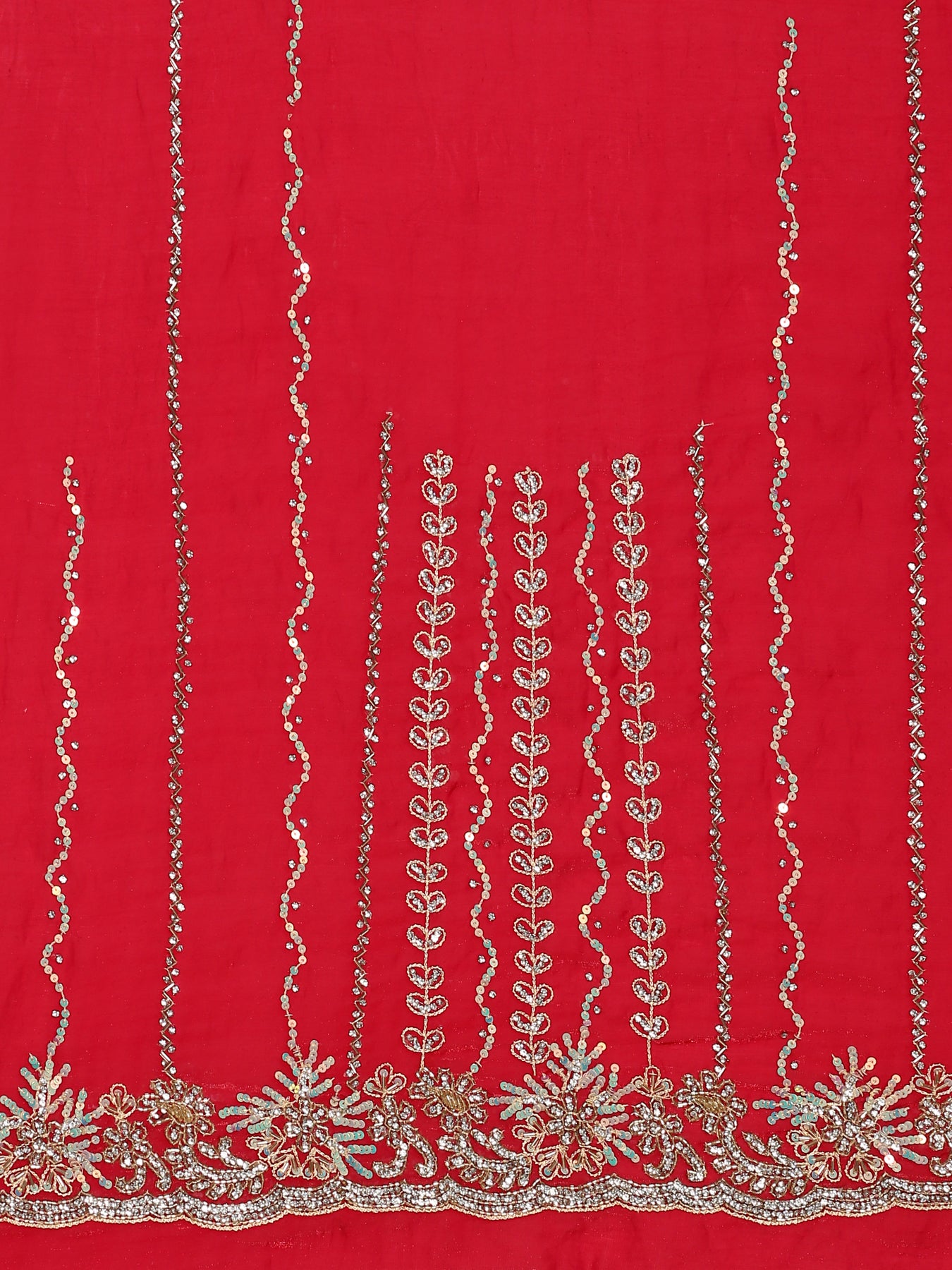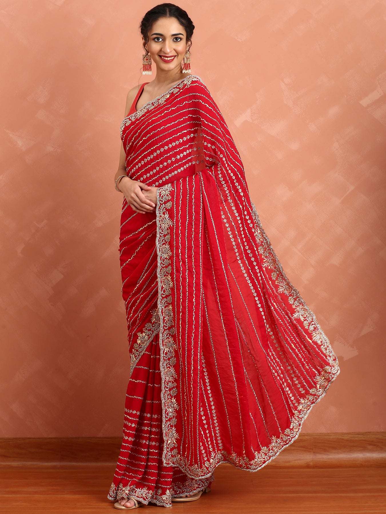 This Red Swarovski and Cut Dana Embroidery Saree showcases expert craftsmanship with meticulously placed Swarovski crystals that add a refined sparkle. The intricate Cut Dana embroidery enhances the saree's rich texture, creating a sophisticated and elegant silhouette. Designed for discerning wearers, this saree perfectly balances traditional artistry with contemporary appeal, ideal for festive occasions and formal events.