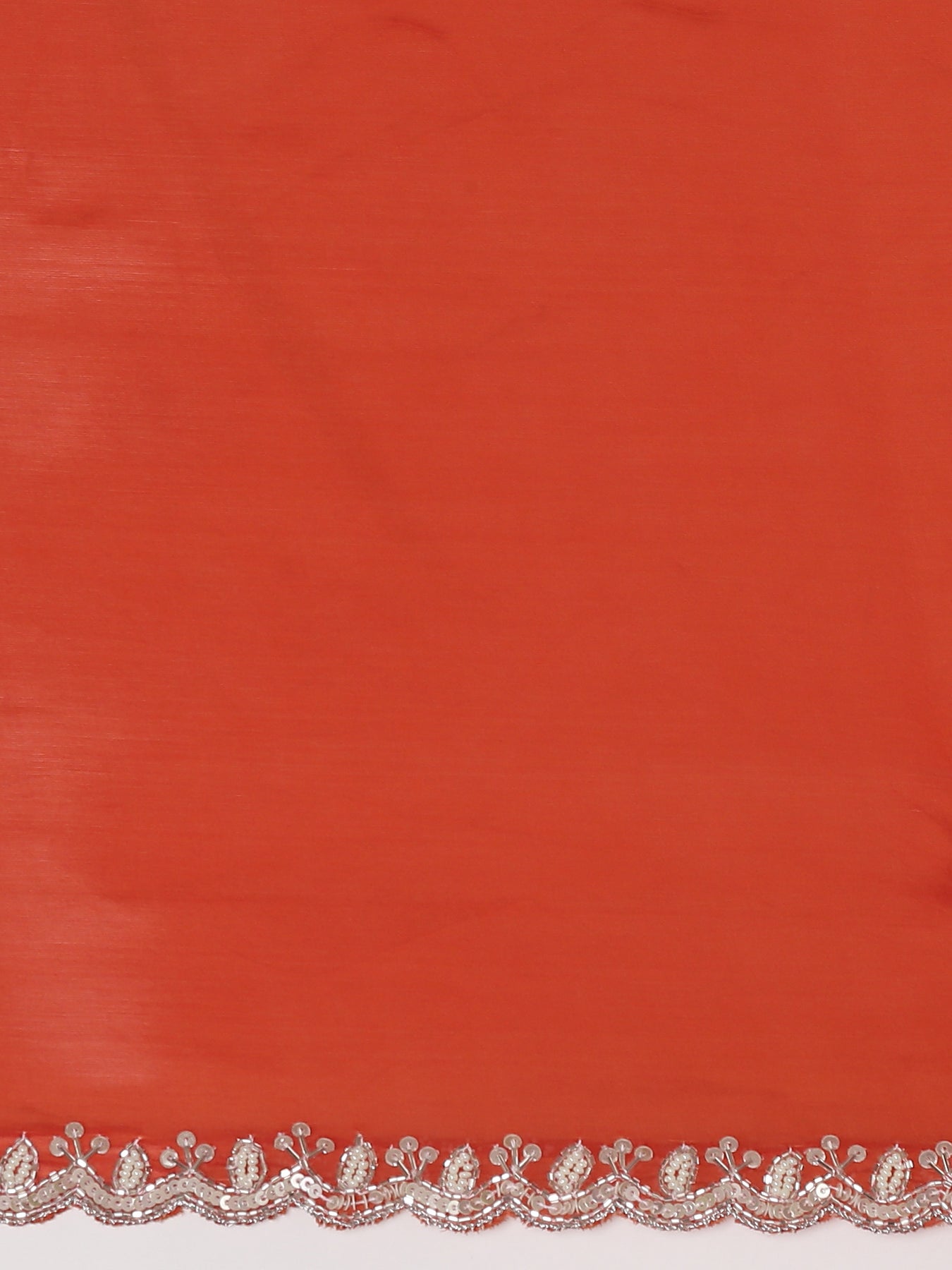 Elevate your elegance with this rust crepe saree adorned with shimmering sequins, perfect for making a graceful statement. The saree comes paired with a readymade blouse featuring intricate heavy work, ensuring a flawless fit and sophisticated style. Ideal for festive occasions and celebrations, this ensemble combines comfort with captivating glamour.