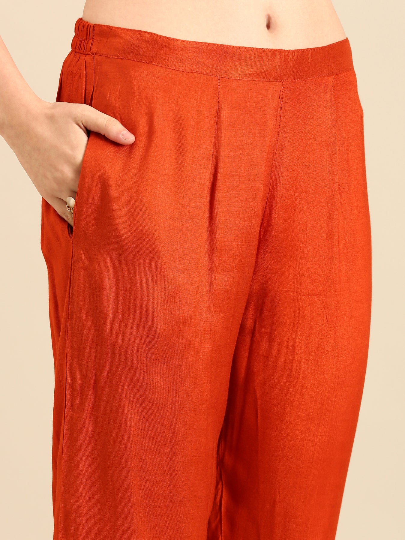 Elevate your wardrobe with this elegant rust-colored Modal fabric suit, exquisitely adorned with delicate thread embroidery enhanced by shimmering sequins. The soft, breathable Modal fabric ensures comfort throughout the day, while the intricate embroidery adds a touch of sophistication and sparkle, perfect for special occasions or festive celebrations. Experience the perfect blend of style and grace with this standout ensemble.