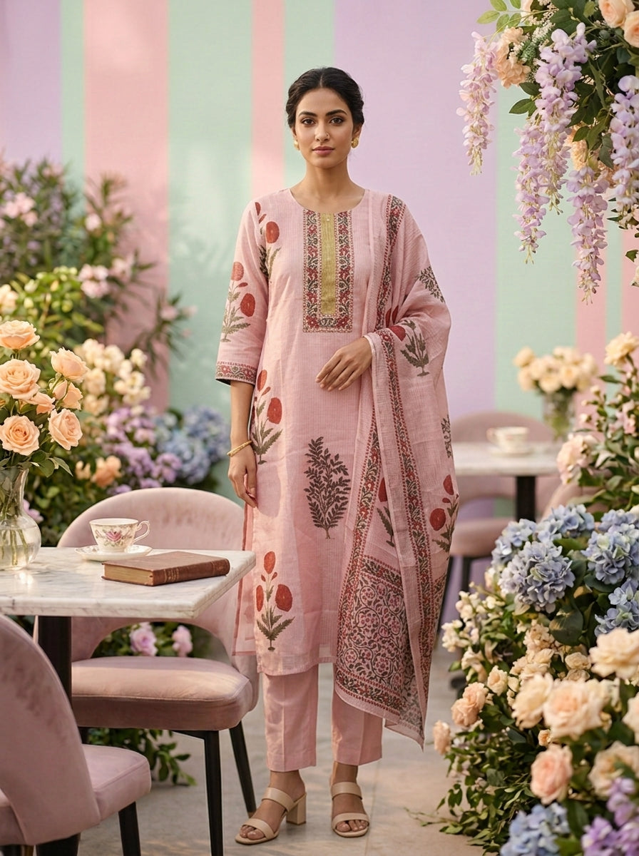 Embrace timeless elegance with this charming three-piece set in soft baby pink cotton. Delicate floral prints add a touch of grace to every piece, perfect for creating effortless, coordinated looks. The breathable cotton fabric ensures comfort throughout the day, while the versatile design transitions seamlessly from casual outings to intimate gatherings. Each piece can be styled independently or worn together for a cohesive ensemble. Ideal for those who appreciate understated sophistication and quality craftsmanship.